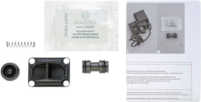 Everything necessary for a complete master cylinder overhaul. Kit includes piston with seals and spring, piston bellows, container bellows, sealing ring for piston mounting screw and silicone brake paste.