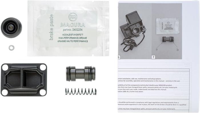 Everything necessary for a complete master cylinder overhaul. Kit includes piston with seals and spring, piston bellows, container bellows, sealing ring for piston mounting screw and silicone brake paste.