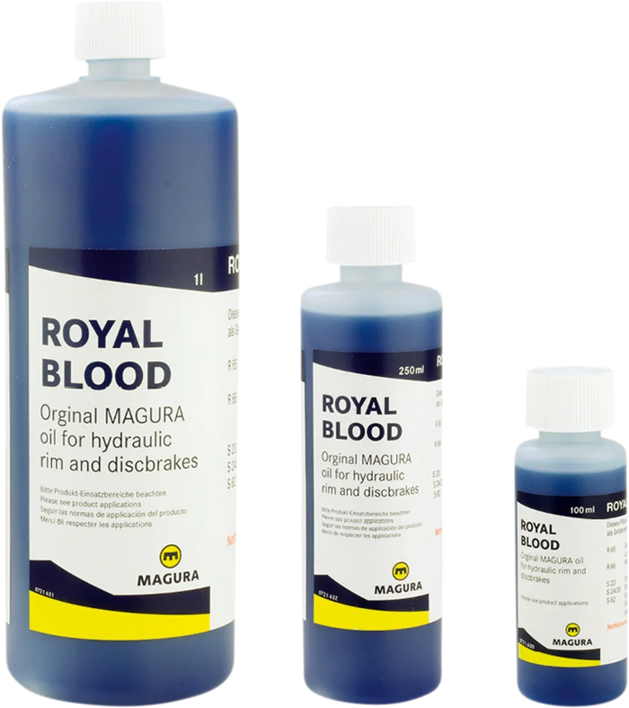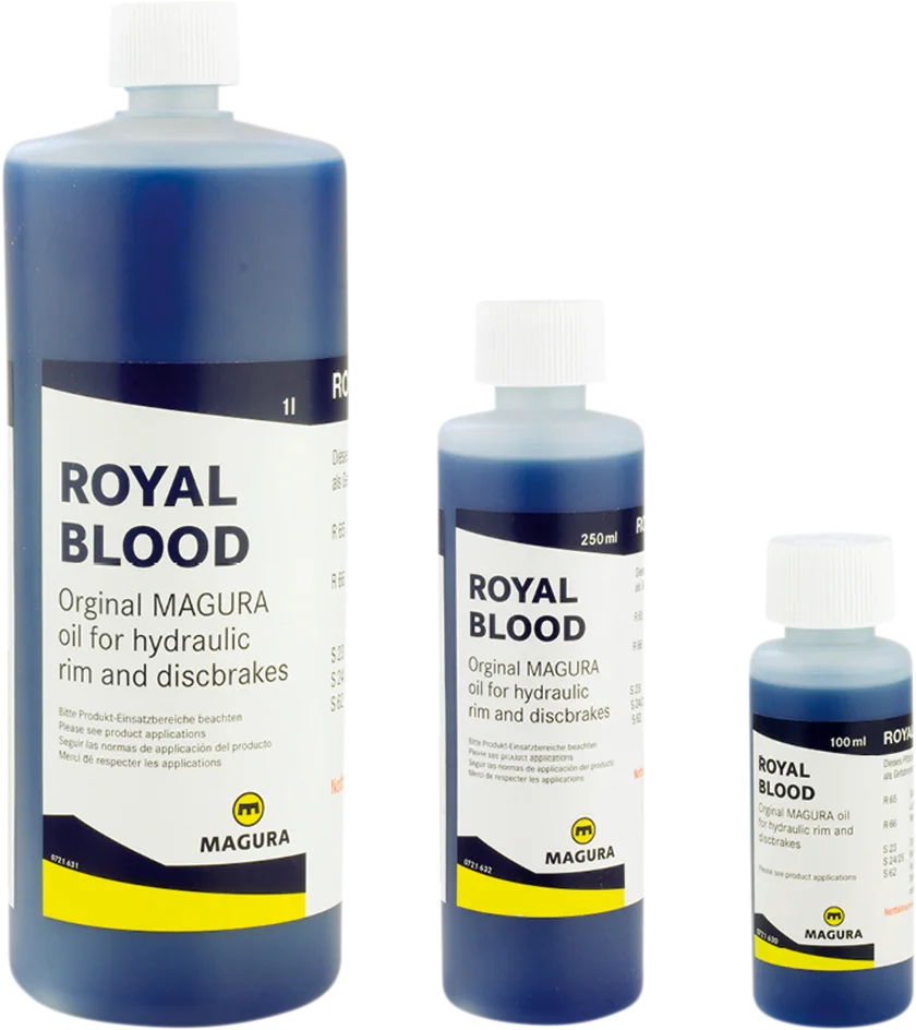 All Magura bicycle disc and rim brakes use a low-viscosity blue mineral oil as a hydraulic medium. Doesn’t irritate skin or damage the paint on frame. Does not absorb water and actually lubricates the whole system. Regular bleeding of old brake liquid is therefore not necessary. Please pay attention to the safety instructions on the packaging while working with Royal Blood.