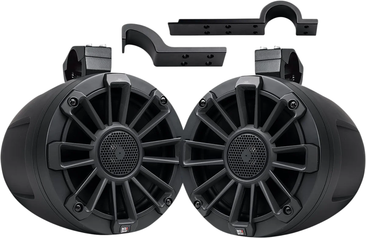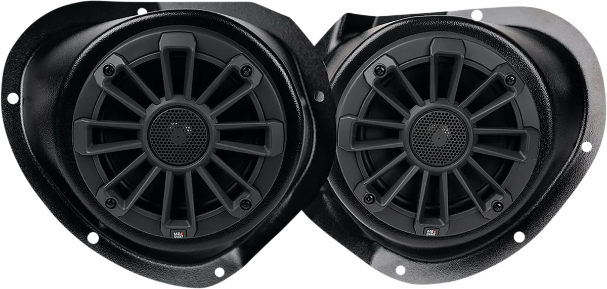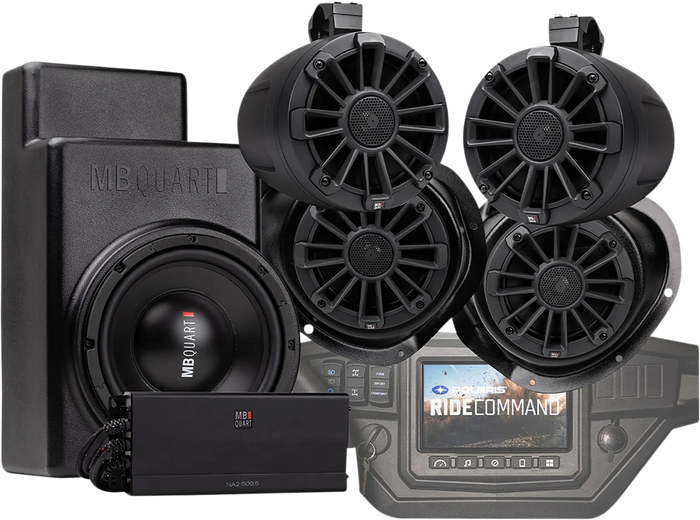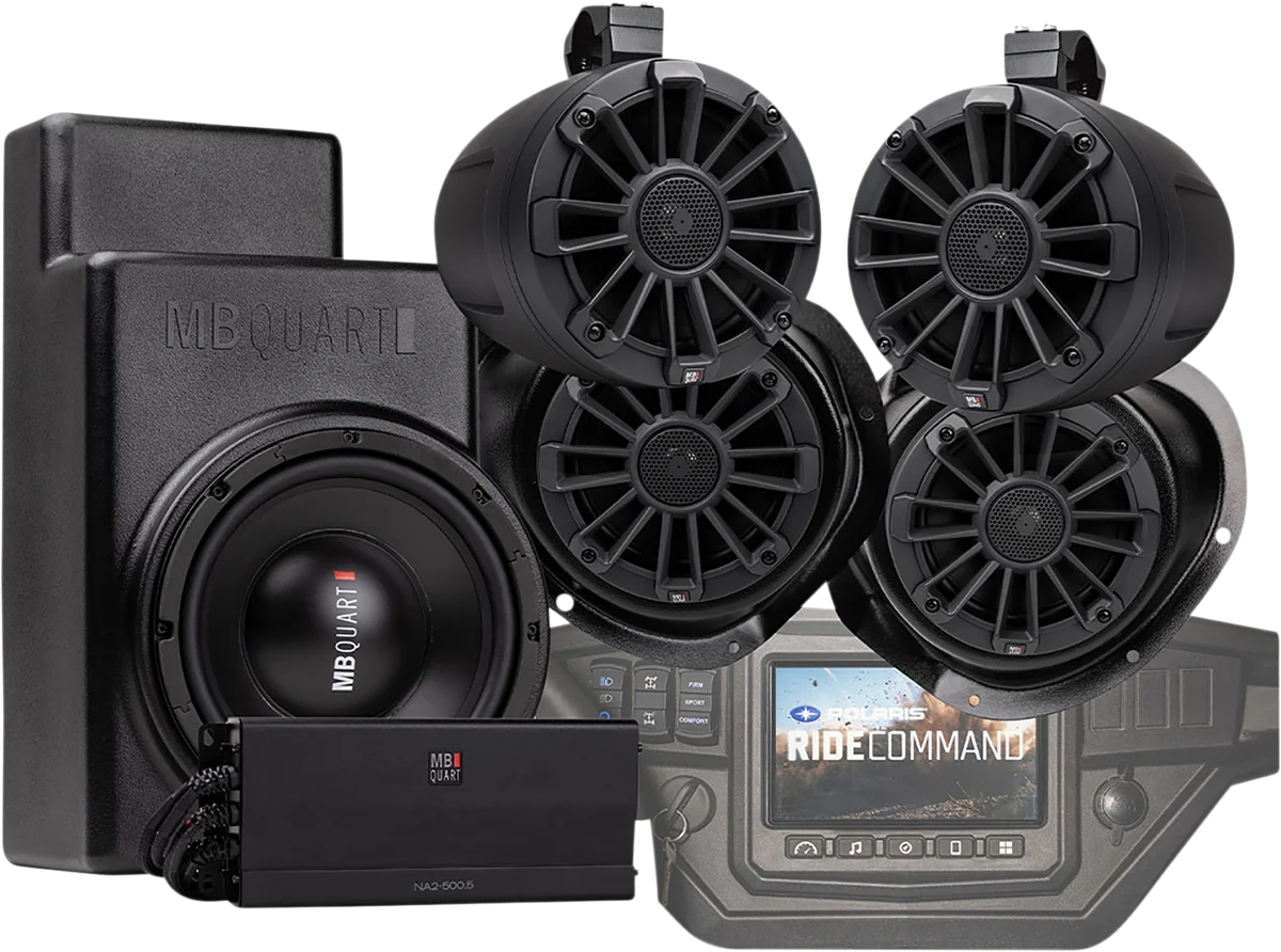 The speakers include a 1" titanium dome tweeter that will deliver natural sounding high frequency response, while producing high volume. Injection molded composition Polypropylene cone produces impactful bass with minimal cone flex. Ranger specific left & right speaker panels are an ultra-compact design that takes up minimal space. The rear speaker pods mount to the OEM cage with the included profile cage mounting hardware. Dual voice coil 10" subwoofer in a high impact HDPE composite enclosure mounts in the front dash. Includes high efficiency, full range Class D 500 W amplifier. Plug and play harness, waterproof connectors with pre-measured wires, and adapters to integrate with Polaris Ride Command are included.