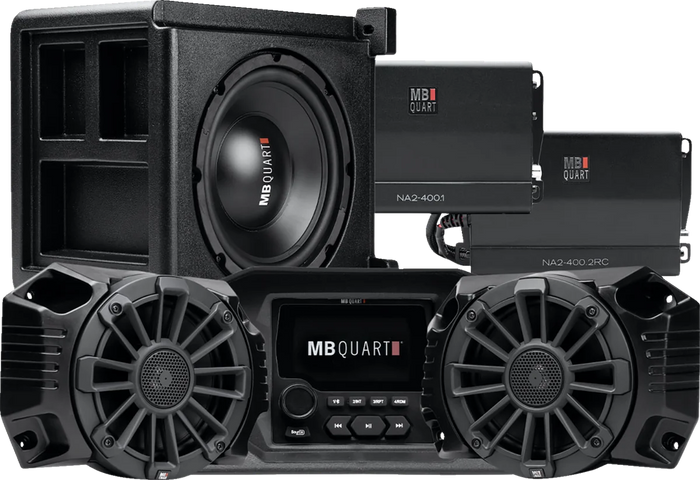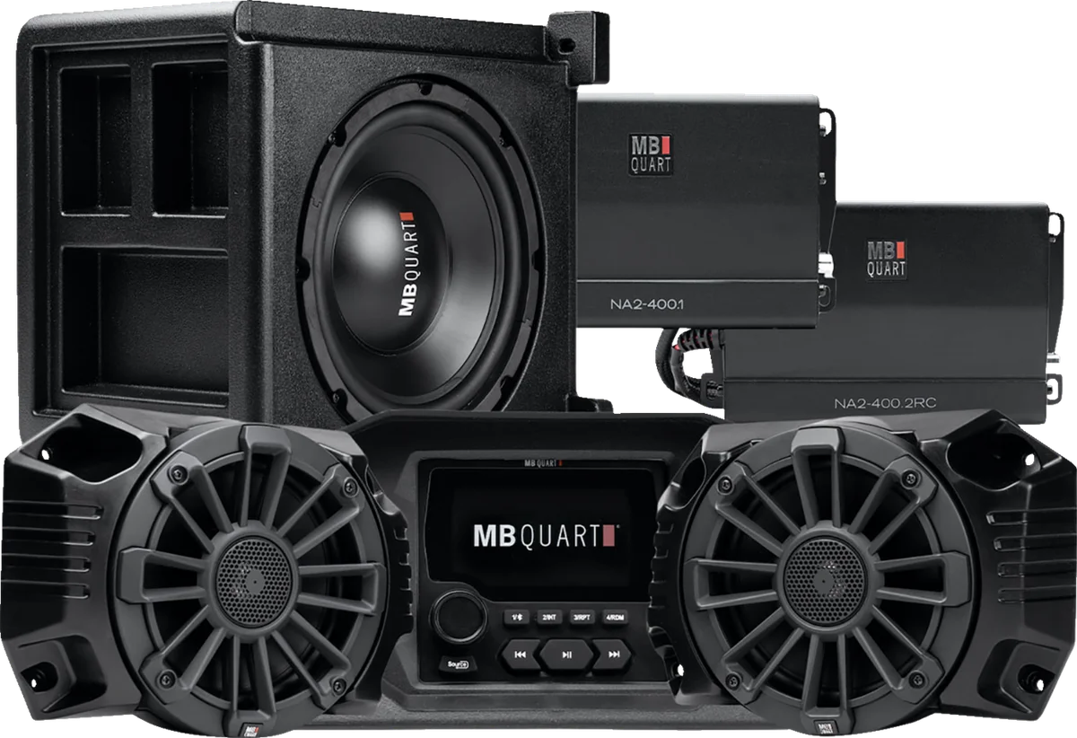 AM/FM, Bluetooth source unit features quick pair that immediately connects to the last device that was connected and also displays album artwork if present. The speakers include a 1" titanium dome tweeter that will deliver natural sounding high frequency response, while producing high volume. Injection molded composition Polypropylene cone produces impactful bass with minimal cone flex. High impact HDPE RANGER specific left and right speaker panels are an ultra-compact design that takes up minimal space. Dual voice coil 10" subwoofer in a high impact HDPE composite enclosure fits under the front passenger seat. 2 Class D compact amplifiers powering two 6-1/2" coaxial speakers and a 10” subwoofer. Plug and play harness and waterproof connectors with premeasured wires included.
