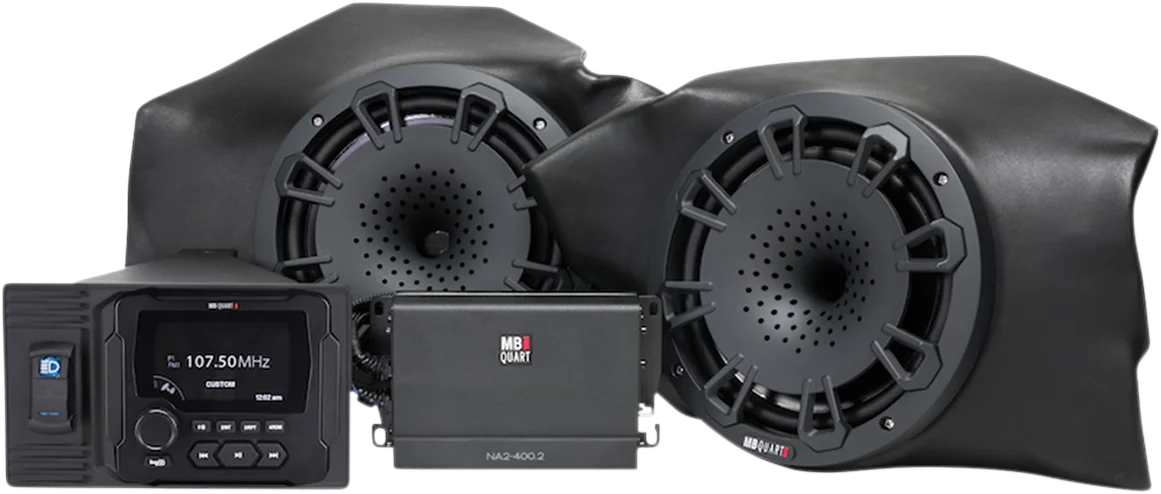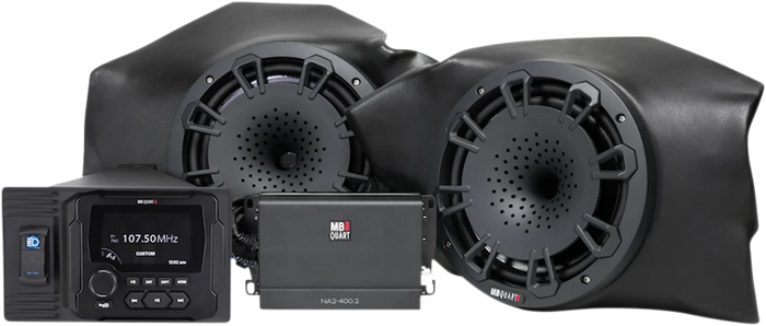 LED source unit with mounting panel includes AM/FM, Bluetooth® with iPod/iPhone® control, dash Mounted USB and AUX input plug. 400w high-efficiency, full-range class D amplifier creates big power, small chassis design with low current draw. Dual 2-way horn speakers, right and left speaker enclosures, easy installation template - no relocation or customization required. High-impact HDPE composite model-specific left and right kick panel enclosures- ultra compact design takes up minimal space. Vehicle-specific wiring harness makes for simple plug and play installation. LIFEShield IPX Rated - fully protected against the elements. Mounting system for amplifiers- the amplifier mounts behind dash on dedicated amp bracket.