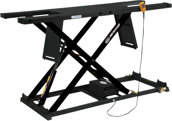 Loading ramp and hand-held remote control included. Five-position safety locking system for extra safety. Lowers to a minimum height of 7.5". Front and rear drop panels. One-ton capacity.