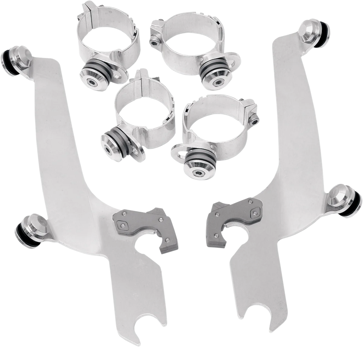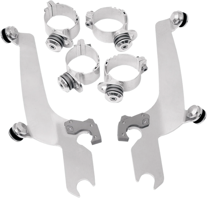Gone are the days of fumbling with tools to remove your windshield. The revolutionary No-Tool Trigger-Lock hardware features an innovative system that allows you to quickly and easily remove your windshields without the use of any tools. A pair of latches lock the windshield down until the spring loaded "trigger locks" are intentionally disengaged, allowing the rider to remove the windshield. Hardware is fully adjustable to achieve just the right windshield angle. Kits are custom-fit to each style of bike for a truly no-hassle installation. Made in the U.S.A..