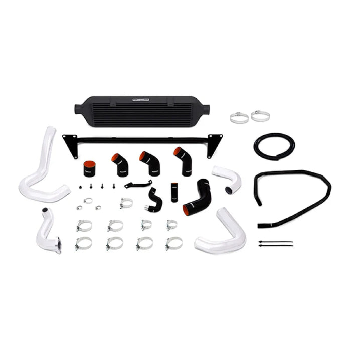 "Designed for applications that demand the greatest airflow and cooling capabilities, the Mishimoto WRX Front-Mount Intercooler Kit will provide your Subaru with the ability to make the most horsepower and torque possible. The Mishimoto front-mount intercooler was designed with a large 28" intercooler core that provides the maximum cooling capability without excessive pressure drops that will wear out any turbocharger over time. The Mishimoto WRX front-mount intercooler features smooth cast end tanks that are CFD tested for maximum airflow with no sharp walls or bends from cut-and-weld end tanks that disrupt airflow. The intercooler provides the best airflow and heat-exchange properties for those time-attack laps, or a 10-second blast down the quarter mile. The Mishimoto Subaru WRX Front-Mount Intercooler also features four mandrel-bent aluminum pipes for optimum airflow. The hot-side pipes are 2.25" in diameter to keep airflow velocities high, giving your car an instant response without excessive throttle lag that plagues many front-mount intercooler designs. The hot-side pipe also features a CNC-machined flange for a leak free connection to the turbo. The cold side of the system features 2.5" to 2.75" mandrel-bent aluminum tubing for maximum airflow, and to match the diameter of your throttle body. This 2015 WRX front-mount intercooler kit contains everything needed for a worry-free installation, including an application-specific crash bar that both supports the intercooler and mounts to existing points on the vehicle. No cutting of the front bumper or drilling is required to install the crash bar and intercooler. The kit includes all necessary mounting brackets, including a new bracket for the air intake. Our WRX front-mount intercooler kit also includes every coupler and clamp you need for a clean install, and compliments the Mishimoto Subaru WRX Performance Air Intake for added cooling power. Mishimoto tested this intercooler on our Stage 2 265whp WRX