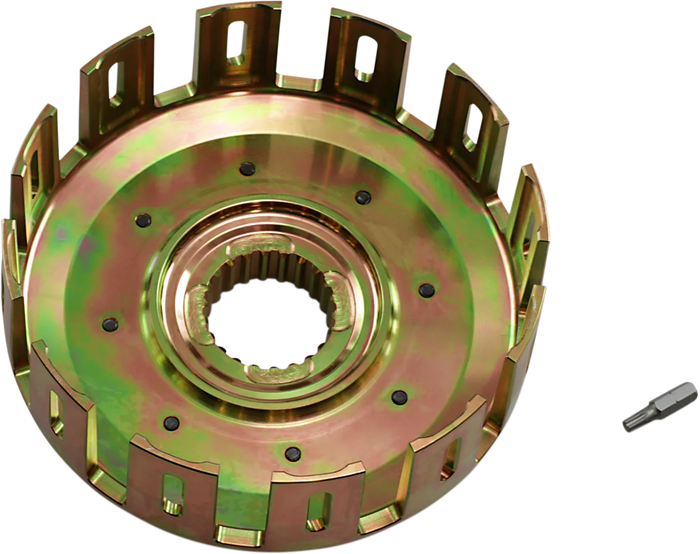 Heavier basket offers the combined effect of a high-performance clutch basket and the added traction of a flywheel weight. Extremely resistant to wear. Increased oiling helps decrease clutch heat fade. Improves clutch performance and life. Constructed of billet steel machined to aerospace tolerances. Made in the U.S.A..