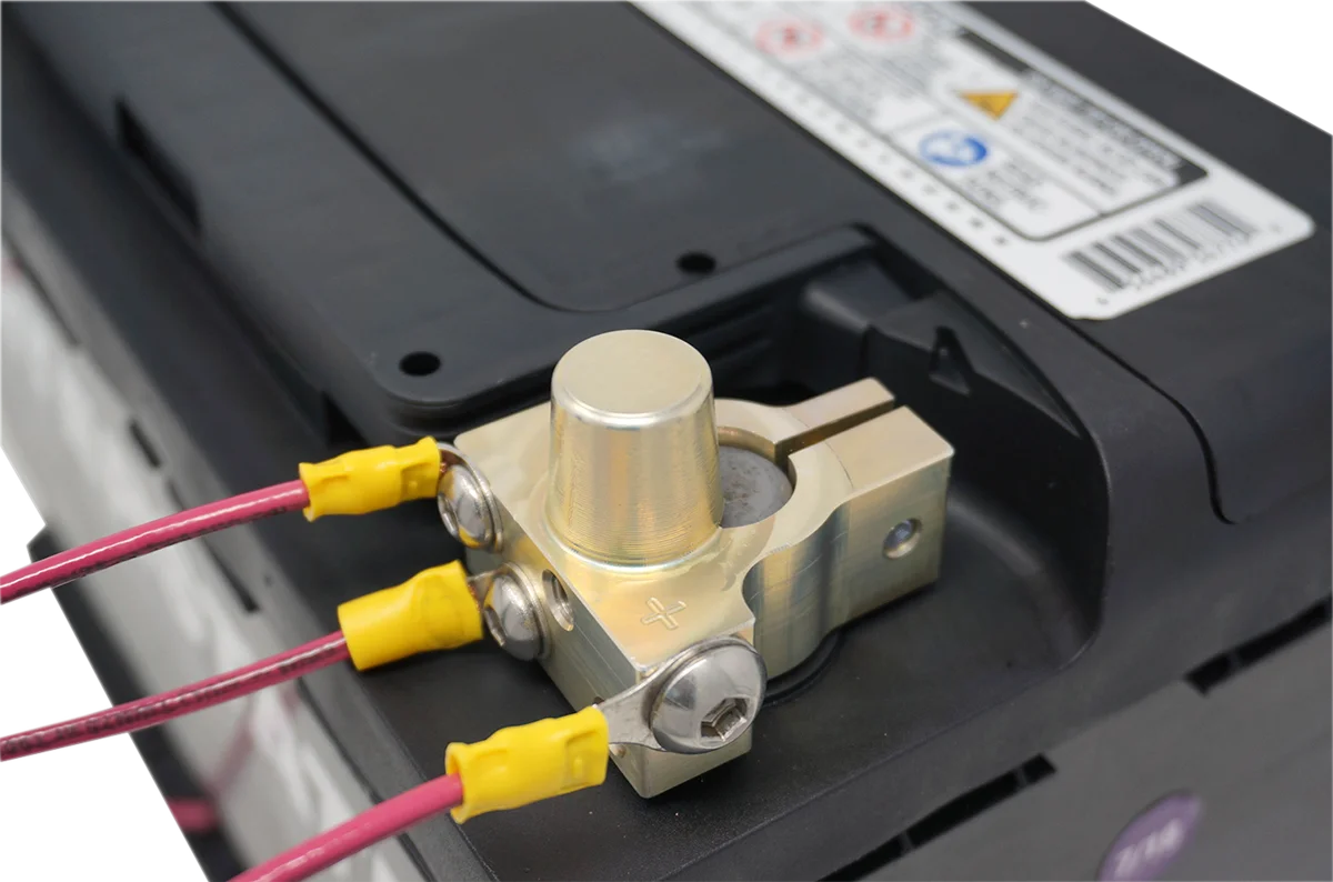 Specifically designed to safely add up to six different accessories requiring 12 volt power onto your battery. Includes both positive and negative terminal blocks. Stacking ring terminals or loose wire ends on battery posts can cause harm to your accessories. Excellent for UTVs with added accessories like stereos, GPS, winch, heaters, etc. Fits any Powersports battery with square bolt-in posts, dry or wet cell. CNC machined from billet aluminum. Made in the U.S.A..