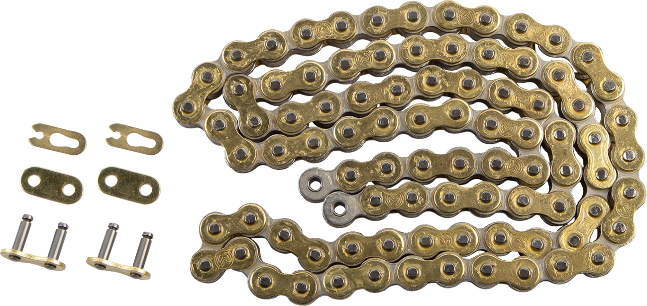 Non-O-ring chain. Designed specifically for mini-racing machines. High application greased chain. High-tensile strength nickel-plated inner link plates. High-tensile rust-resistant gold-plated side plates.