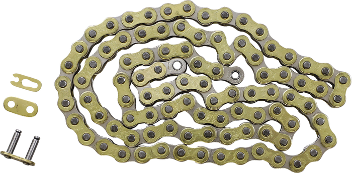 Non-O-ring chain. Designed specifically for high-powered, mini-racing machines. High application greased chain. High-tensile strength nickel-plated inner link plates. High-tensile rust-resistant gold plated side plates. Solid rollers. Clip-type connecting link included. Recommended for applications between 80-125cc. Replacement connecting link available.