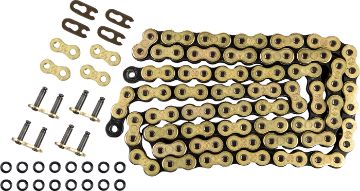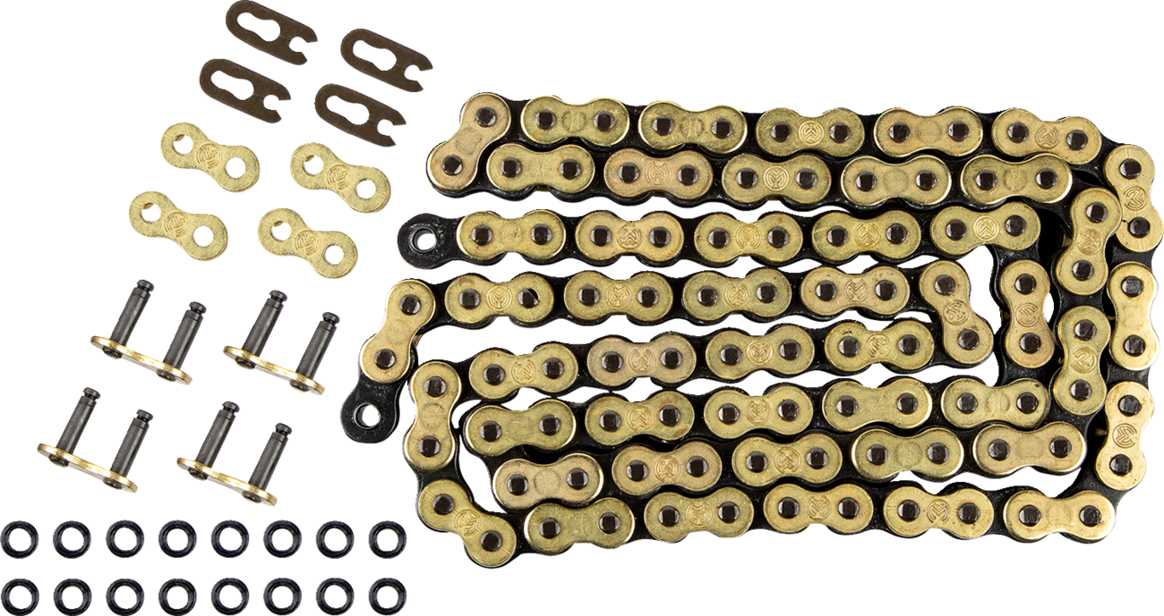 This is the top of the line; the strongest, most durable sealed chain that we offer. FB = Fine Blanking, an incredibly precise manufacturing process that yields perfectly cut links. Tight tolerances make the plate, pin, and bushing union accurate and strong. Due to the accuracy of the cuts and the use of stronger alloyed steel, the FB has our highest tensile strength rating, nearly 8,000 lb.. Special sealing rings are chemically treated to gain strength and reduce friction. The FB treatment allows the O-rings to be impregnated with grease. FB rings are stronger and more durable than X-rings, with significantly less friction. Gold links and rollers, silver inner plates, pins and bushings. Clip-type connecting link included. Recommended for applications 450cc and above. Replacement connecting link available.