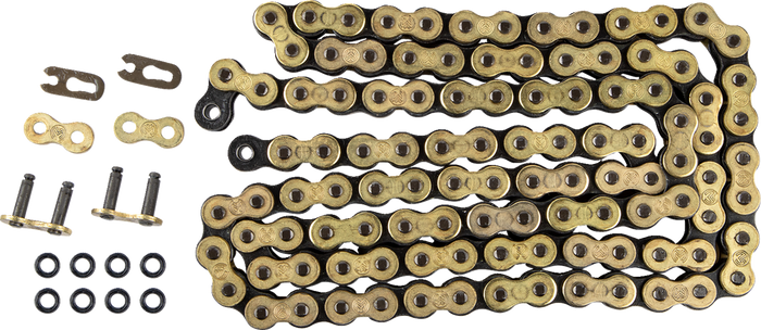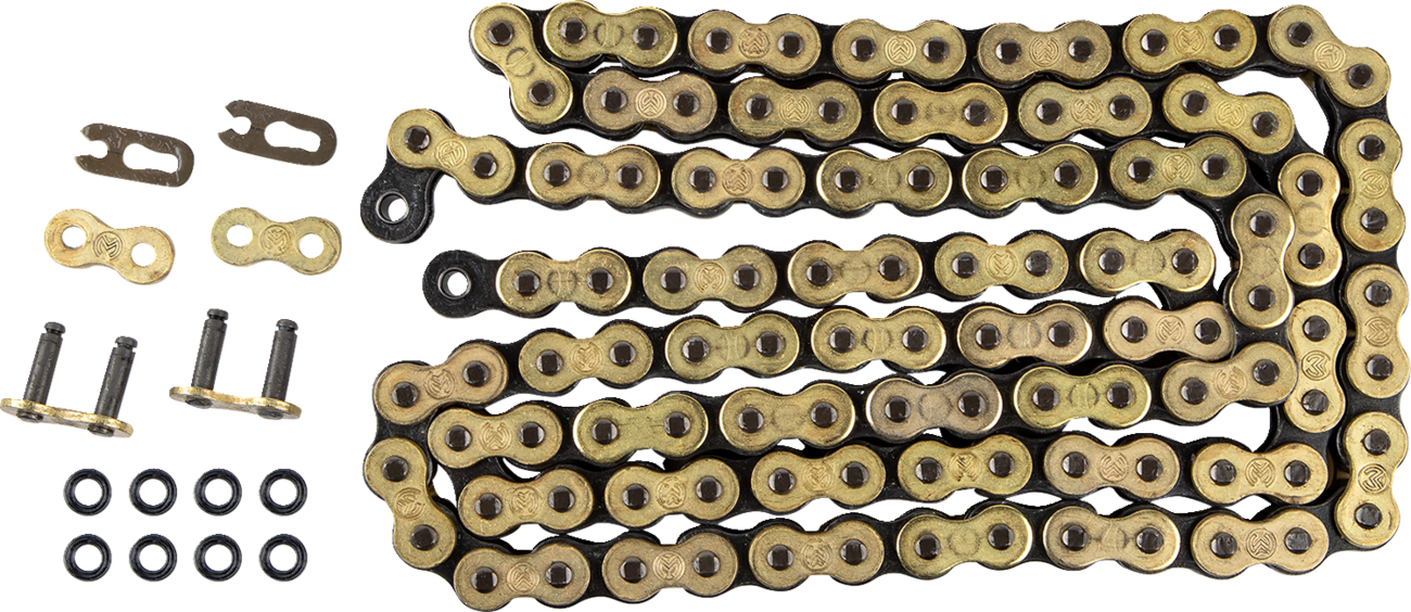 This is the top of the line; the strongest, most durable sealed chain that we offer. FB = Fine Blanking, an incredibly precise manufacturing process that yields perfectly cut links. Tight tolerances make the plate, pin, and bushing union accurate and strong. Due to the accuracy of the cuts and the use of stronger alloyed steel, the FB has our highest tensile strength rating, nearly 8,000 lb.. Special sealing rings are chemically treated to gain strength and reduce friction. The FB treatment allows the O-rings to be impregnated with grease. FB rings are stronger and more durable than X-rings, with significantly less friction. Gold links and rollers, silver inner plates, pins and bushings. Clip-type connecting link included. Recommended for applications 450cc and above. Replacement connecting link available.