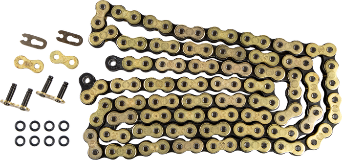 This is the top of the line; the strongest, most durable sealed chain that we offer. FB = Fine Blanking, an incredibly precise manufacturing process that yields perfectly cut links. Tight tolerances make the plate, pin, and bushing union accurate and strong. Due to the accuracy of the cuts and the use of stronger alloyed steel, the FB has our highest tensile strength rating, nearly 8,000 lb.. Special sealing rings are chemically treated to gain strength and reduce friction. The FB treatment allows the O-rings to be impregnated with grease. FB rings are stronger and more durable than X-rings, with significantly less friction. Gold links and rollers, silver inner plates, pins and bushings. Clip-type connecting link included. Recommended for applications 450cc and above. Replacement connecting link available.