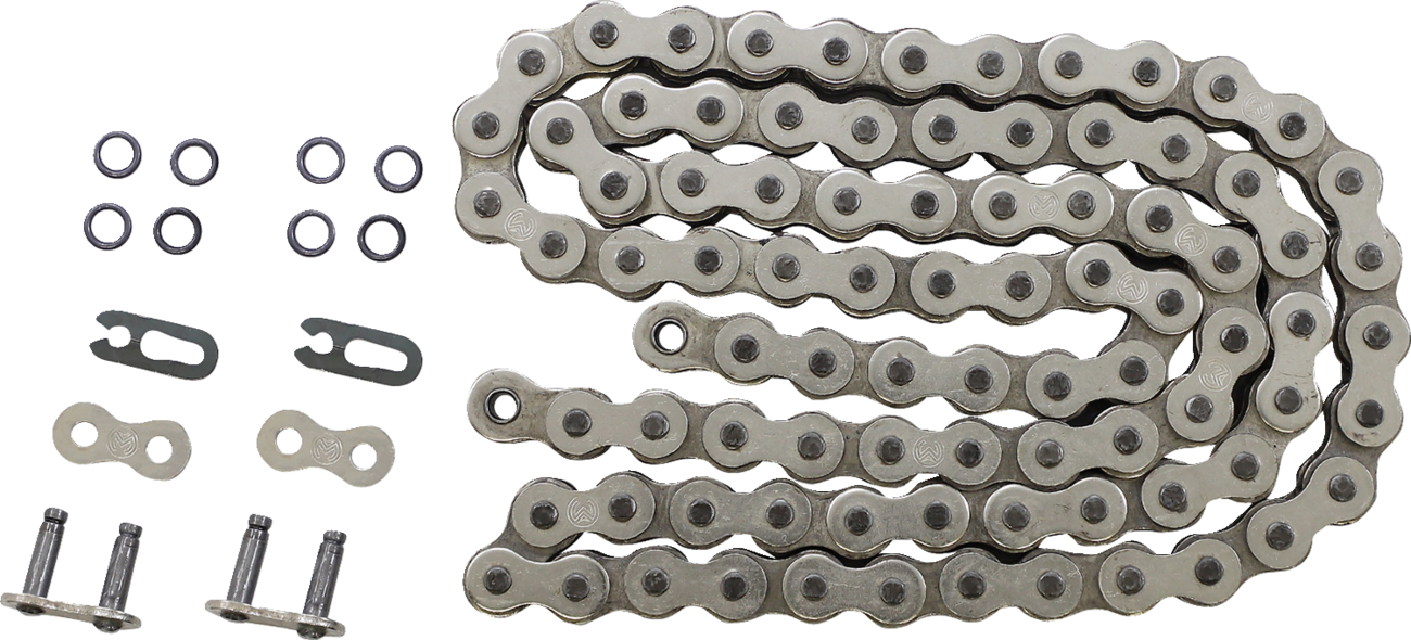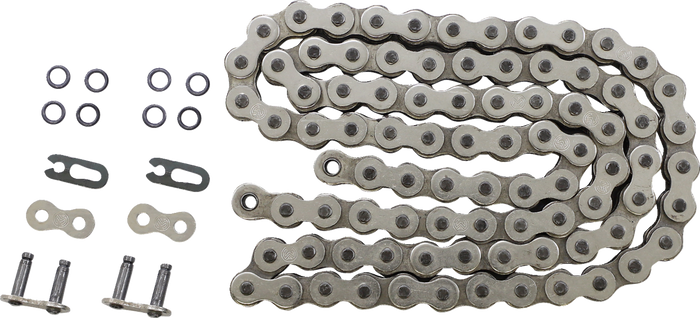 O-ring chain. Extra-high-tensile-strength link plates. Rust-resistant nickel-plated side plates. Vacuum-injected greased chain. Solid bushings. Recommended for applications between 350-450cc. Clip-type connecting link included. Replacement connecting link available.