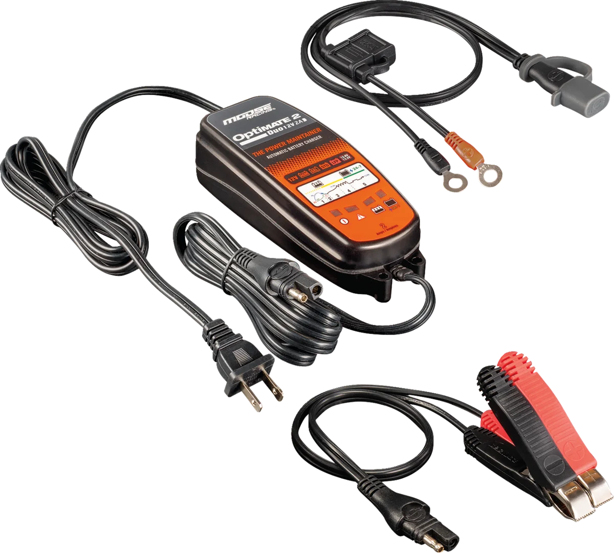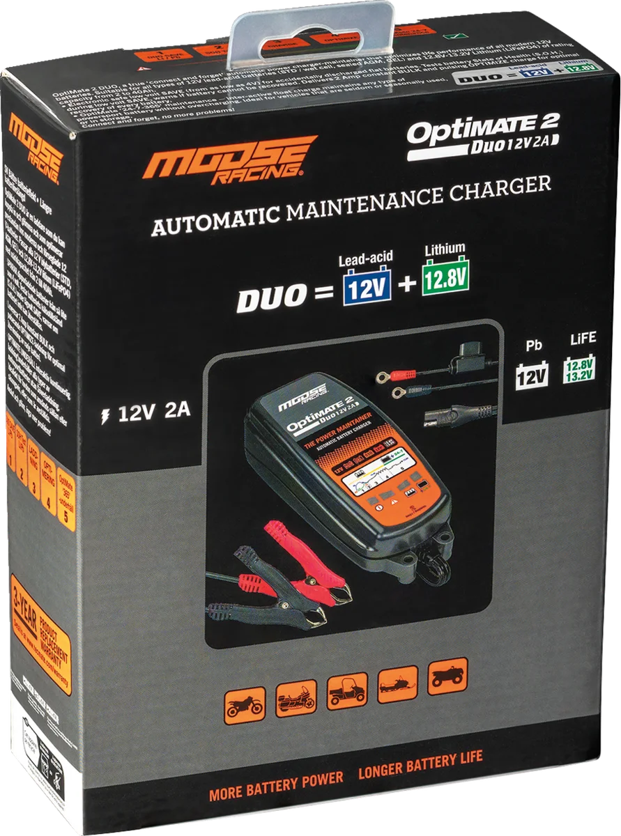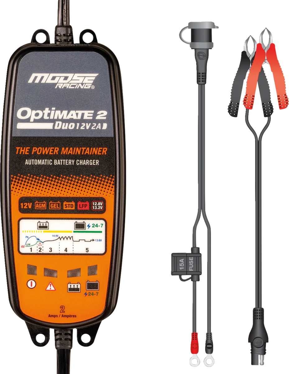 Weatherproof case with wall mounts, with 6ft / 180cm AC supply lead and 6ft / 180cm charge lead ending in SAE connector. Ideal for: AGM, GEL & STD 12V batteries from 6 – 96Ah & Lithium (LiFePO4) 12.8/13.2V batteries from 2 – 24Ah. Fully automatic; adapts automatically to Pb or LFP battery; 24-7 safe long term maintenance. No risk of overcharging; totally safe for vehicle electronics; sparks suppressed. Indoor / Outdoor (lowest temperature: -40°F / -40°C); weatherproof. Input: Global (100-240V 50-60Hz), high efficiency (CEC listed). Automatic shut-down if short-circuited or battery disconnected. Charging volts: nominal: 12V & 12.8V range: 4V – 14.4V. Included: weatherproof battery lead & battery clip set. Maintains battery at full charge and good health. Warns when battery damage is detected. 2A (constant current) charging amps. Stand-by power is less than 0.5W. Low volt start of 4V. Ideal for motorcycles, ATV's, scooters and jet ski's..