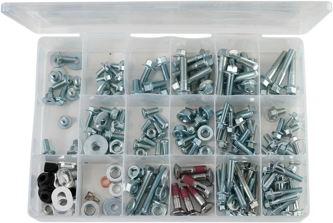 This 200 piece kit includes several hardware pieces, sprocket bolts, rotor bolts, valve stem parts, Fuji lock nuts, replacement bolts, misc washers and more. Parts can cross over to older models as well.