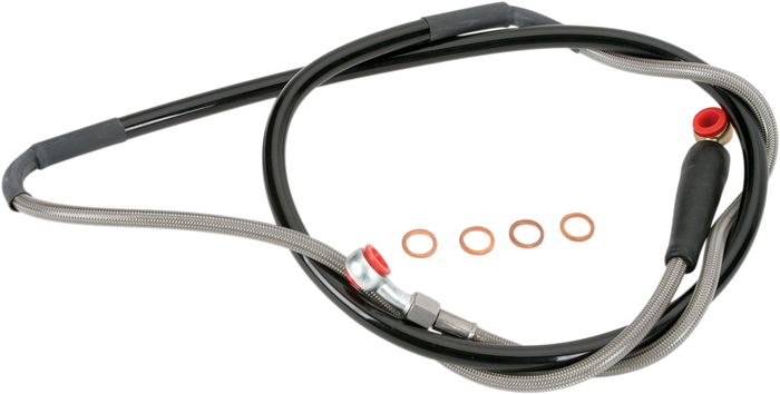 Swivel union ends are the secret to easier fitting, and ensure a kink- and stress-free installation. Venhill Engineering in the UK makes Moose Racing Stainless Steel Brake and Clutch lines to the highest specifications. Each line is made from top quality DuPont Teflon®-coated hose, wrapped with British-made stainless steel, and PVC-coated for protection and great looks. Rubber protection boots and extra-rigid tubing are used to protect vulnerable areas from heat and impact and to prevent hose flex under compression. Each line is designed to withstand a minimum of 14,000 psi. Installing Moose Racing stainless lines gives a large performance increase by significantly reducing expansion under pressure and absorption of water when compared to stock rubber hoses.