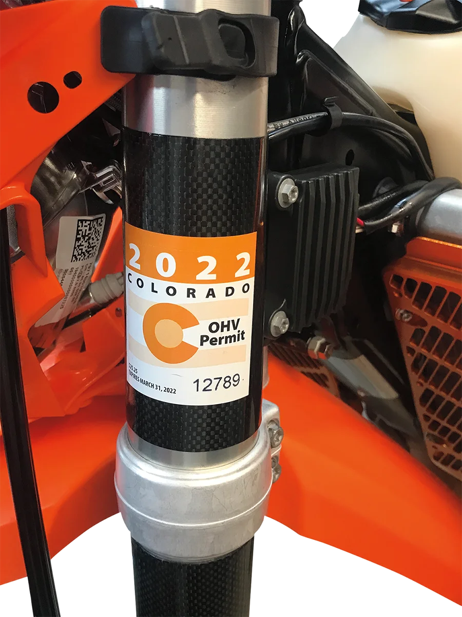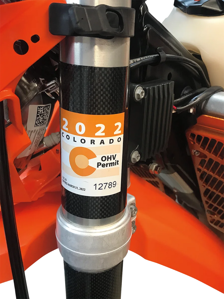 Made from carbon fiber and designed to clip over the upper fork leg. Stick your registration sticker directly to the carbon holder, then clip on to the fork leg. Easy way to prevent your tag from falling off when riding on the trail. Looks good and helps protect fork leg.