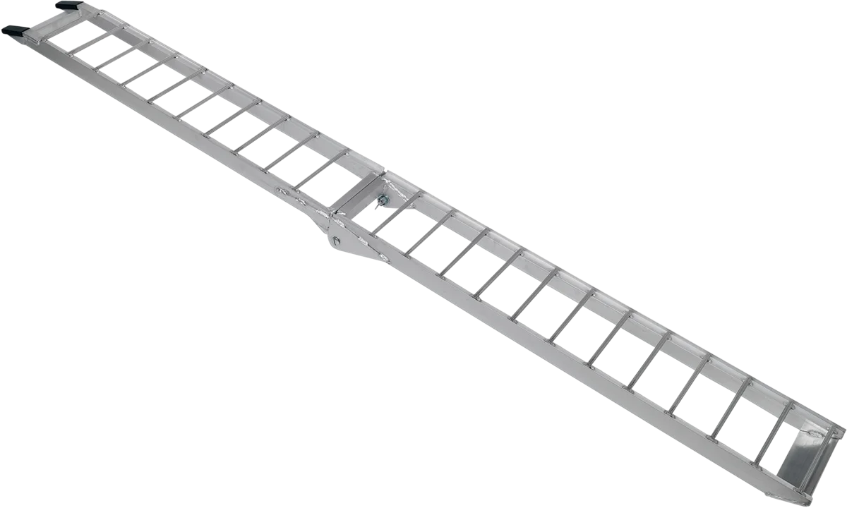 Exclusive design folds flat for easy storage and transportation. Made from durable and lightweight 6063 aluminum. Rubber coated ramp fingers help keep ramp from slipping. Weighs only 9.5 lb.. Maximum load capacity of 400 lb.. Do not ride motorcycle on ramp at any time..