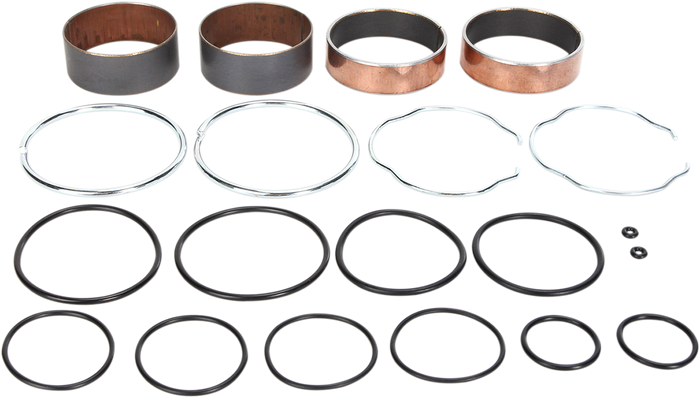 Bushings are dyno-tested to 500,000 strokes with less wear than OEM bushings. Kit includes two slider bushings and two leg bushings. Kit includes all copper washers and O-rings. Kit includes two fork seal snap rings.