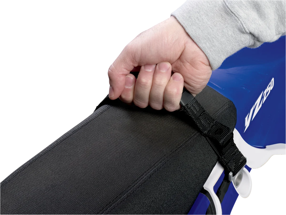 Buckles and bushings are made from stainless steel. Elastic tension keeps it snug and out of your way until you need to use it. 1" webbing is strong, thick and easy to grab. Double-weave buckle lets you adjust length to suit personal preference and accommodate taller seats or other modifications. Fits nearly any bike that uses two bolts to attach the seat to the sub-frame (17" max length between the bolts). Also fits nearly all KTM models with the single under-fender seat bolt. Multiple sizes of mounting hardware included.
