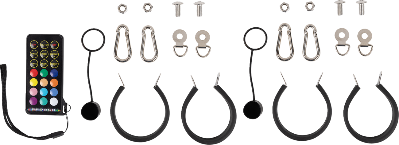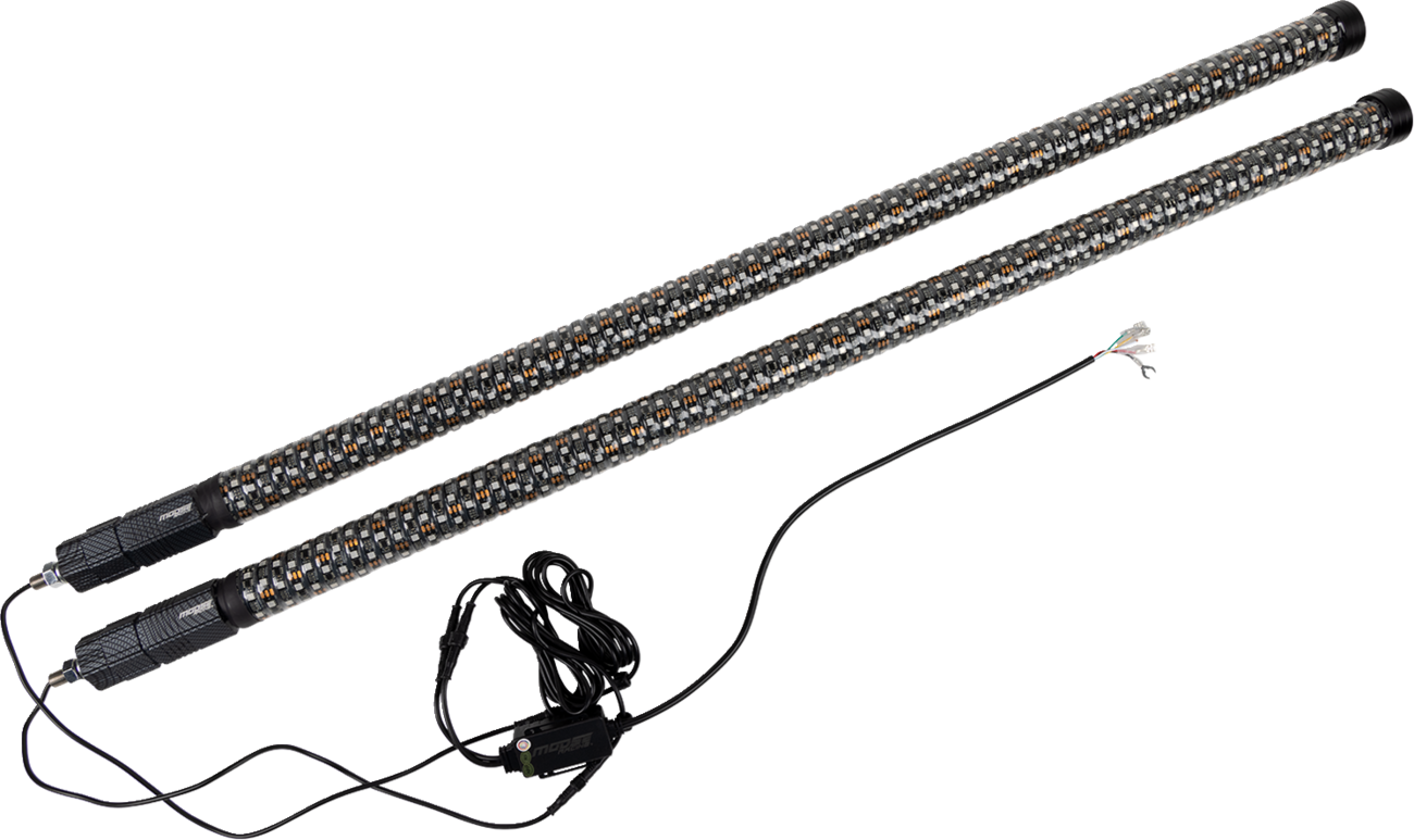 2" inner diameter tube and more LEDs than a 5' Chasing whip. The quick release are quick to remove, and quick to install. The innovative Chasing whip bases feature all the wiring that the whip needs built inside the base itself. Bluetooth control via a free, easy-to-use app. Provides ultimate functionality including music sync, color, pattern and light effect customization, color brightness speed control, and group LED control. Chasing function with 300 different colors and 200 patterns, including flash, strobe and fade-through colors, stream, cascade and different color combinations from top, bottom, and middle; adjust speed/brightness or lock on one color. IP67 dust and waterproof. Included flag is interchangeable or remove it completely. Includes: 2 whip lights, remote, wiring harness, Moose flags, American flags, dust caps, flag hardware and install instructions.