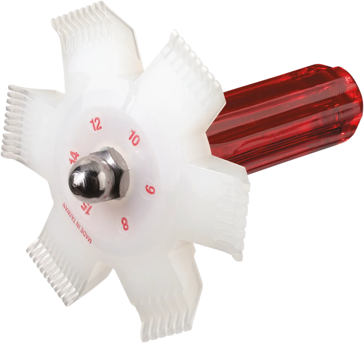 The straightener head is 3-1/8" in diameter and straightens 8, 9, 10, 12, 14, or 15 fins per inch. Straighten damaged fins and remove debris without danger of puncture. A quick tool for putting all those cooling fins back to work. Straightener sections are clearly marked for fin size. Compact enough to use even in confined spaces.