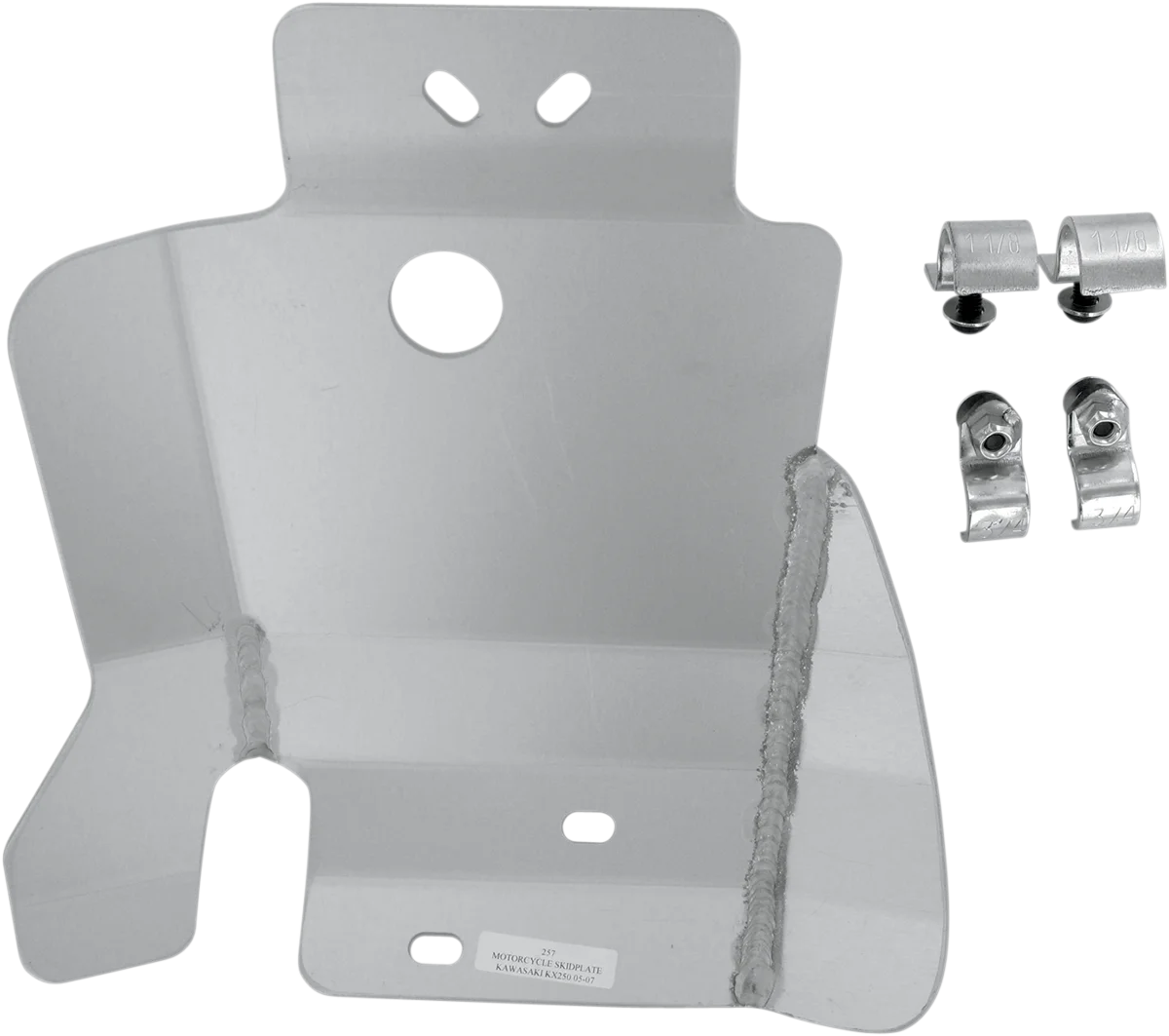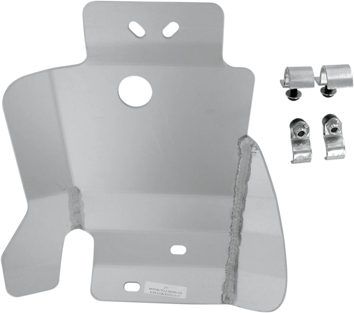Protect vital engine parts and cases from rocks and debris. Clear anodized for corrosion protection and good looks. Skid plates made from 3/16" 5052 H-32 aluminum. Smooth underside won't snag when crossing logs. Oil drain hole on all required models. Heat-treated chromoly steel clamps keep plates mounted securely. All mounting hardware included. Made in the U.S.A..