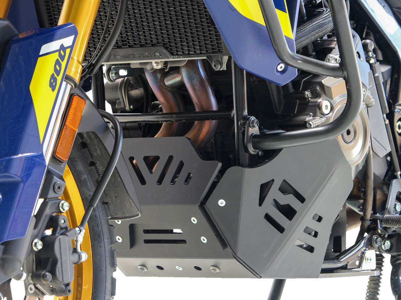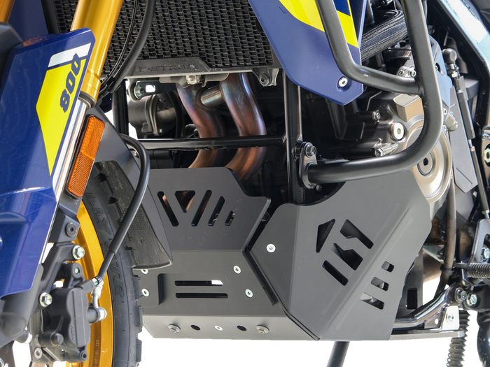 Independent linkage guard to maximise the chances of compatibility with after market center stands. 30 - 40% lighter than its aluminum equivalent. This bash plate will absorb impacts without saving deformations and will not generate any vibrations. Polyethylen reduces projections noise to ensure more confortable rides. Compatible with Hepco & Becker, Outback Motortek et SW Motech crash bars. Some modifications may be required about center stands..