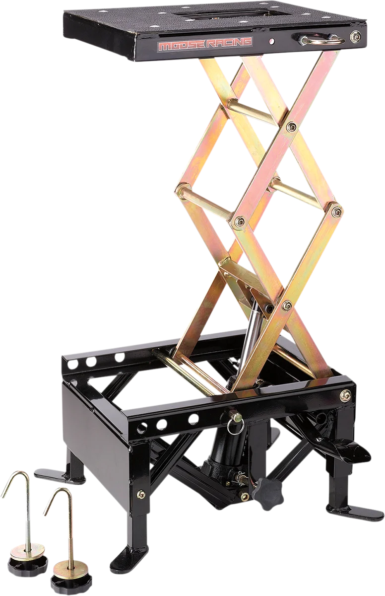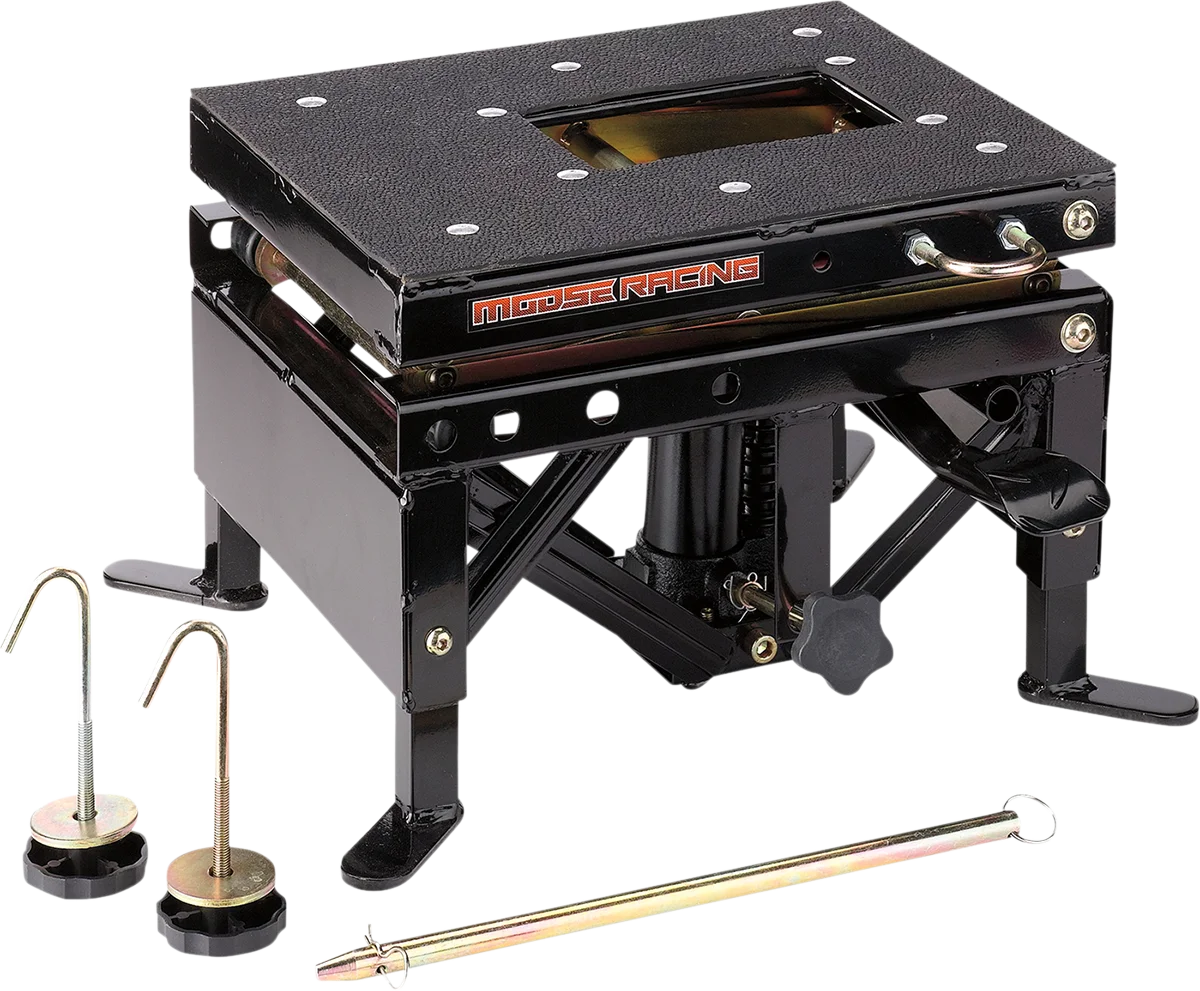 Built with steel construction that has a black powder-coated finish for added durability that outperforms aluminum lift stands. Secure system keeps bike on stand with J-hooks that tighten on the footpegs to prevent movement in the raised position. Locking bar relieves pressure from pump and prevents bike from prematurely lowering while being used. Large 15” x 12” top surface is coated with thick, durable non-slip material and has a built-in drain hole. Adjustable feet accommodate bikes with differences in ground clearance. Raises easily with foot-activated hydraulic pump. Locks at 16-1/4”, 22-3/4”, 28” and 32” heights. Easily lifts bikes from 50cc to 650cc. Lowers by releasing valve knob. Down position height is 12-3/4".