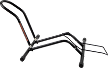 Unique design holds bike upright by simply rolling onto the stand. Adjustable design fits most wheels up to 29.5" diameter and 2.80" in width. Rubber feet add stability and help keep the stand in place. Powder-coated tubular steel is strong and withstands abuse. Light assembly required. Hardware and instructions included.