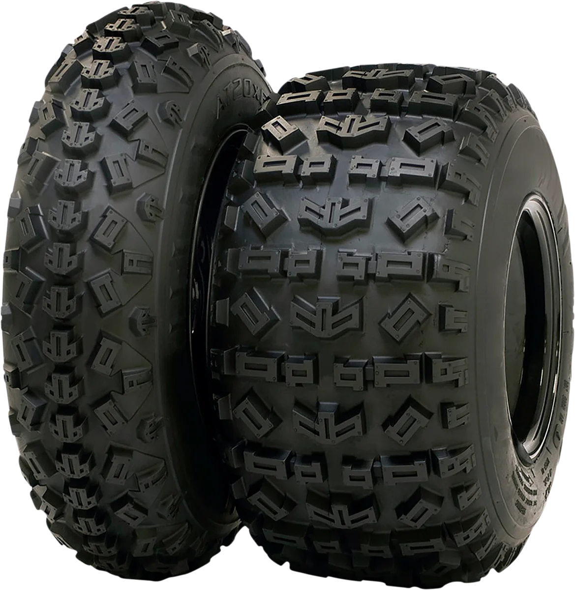 Well-designed tread pattern with square-edged knobs alternating between rows of straight knobs and inverted V's. Capable of handling a wide variety of conditions from hard-pack to loose sand. Aggressive pattern for great hook-up. Semi-soft compound construction. NHS (Not for highway service)..