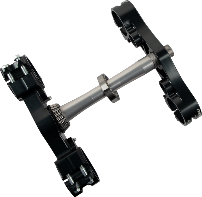 Durable high quality 6082 aluminum to optimize rigidity and reduce weight. Steering stem comes pre-assembled and is pressed into lower clamp which includes OEM bottom bearings. Split design clamping area provides more accurate pressure and an even clamping surface to the fork, without distortion or binding of the fork tube. Bar mounts available in 1-1/8” diameter with either 35 mm or 40 mm rise (sold separately). Bar mounts come standard with rubber cones, solid aluminum cones are also available (sold separately). Standard offsets. Made in Italy.