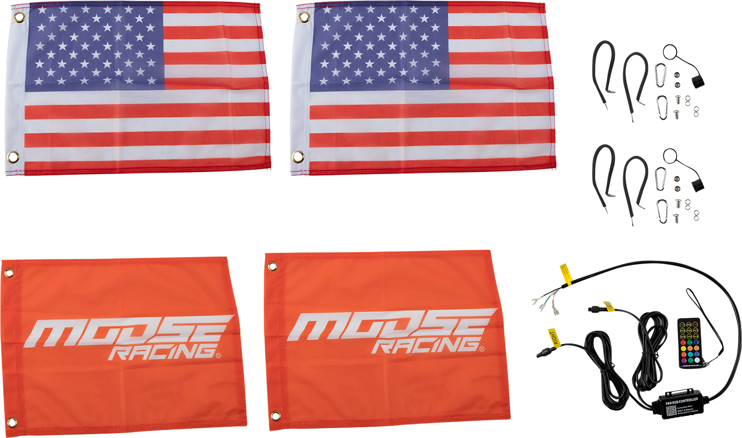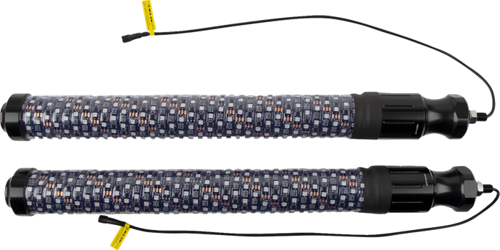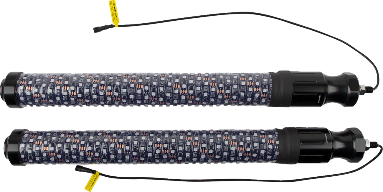 2" inner diameter tube and more LEDs than a 5' Chasing whip. The quick release are quick to remove, and quick to install. The innovative Chasing whip bases feature all the wiring that the whip needs built inside the base itself. Bluetooth control via a free, easy-to-use app. Provides ultimate functionality including music sync, color, pattern and light effect customization, color brightness speed control, and group LED control. Chasing function with 300 different colors and 200 patterns, including flash, strobe and fade-through colors, stream, cascade and different color combinations from top, bottom, and middle; adjust speed/brightness or lock on one color. IP67 dust and waterproof. Included flag is interchangeable or remove it completely. Includes: 2 whip lights, remote, wiring harness, Moose flags, American flags, dust caps, flag hardware and install instructions.