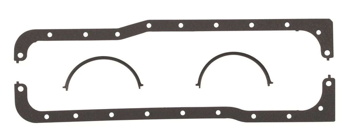 | Description_MKT | Manufactured from cellulose/nitrile composition gasket material. A black latex rubber coating is applied to outside of gasket to help seal minor oil pan rail irregularities and eliminate the possibility of oil leakage. Provides excellent sealing and durability. Complete with molded rubber front/rear oil pan seals where applicable. For original equipment replacement, high performance street, drag race and oval track. |
