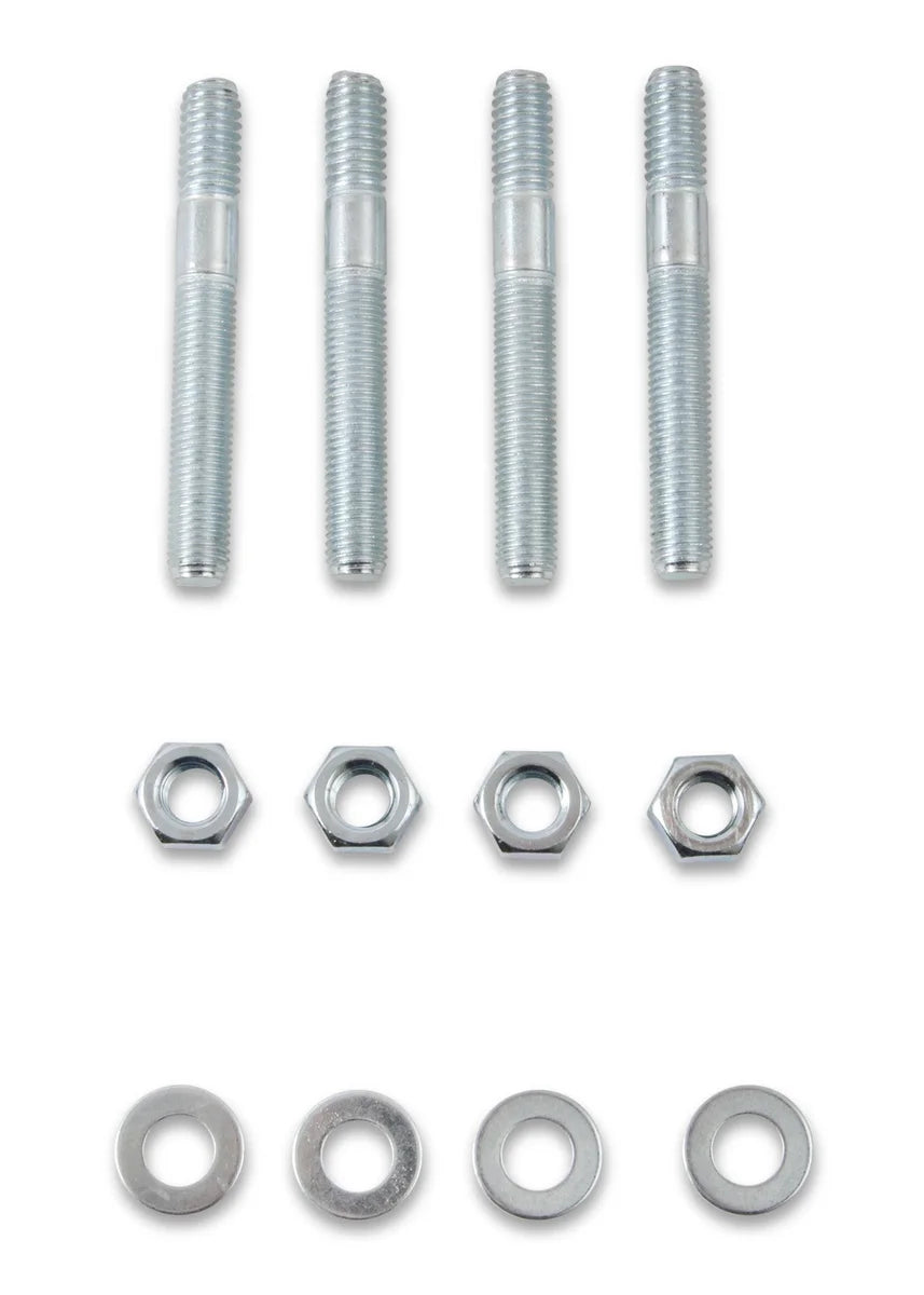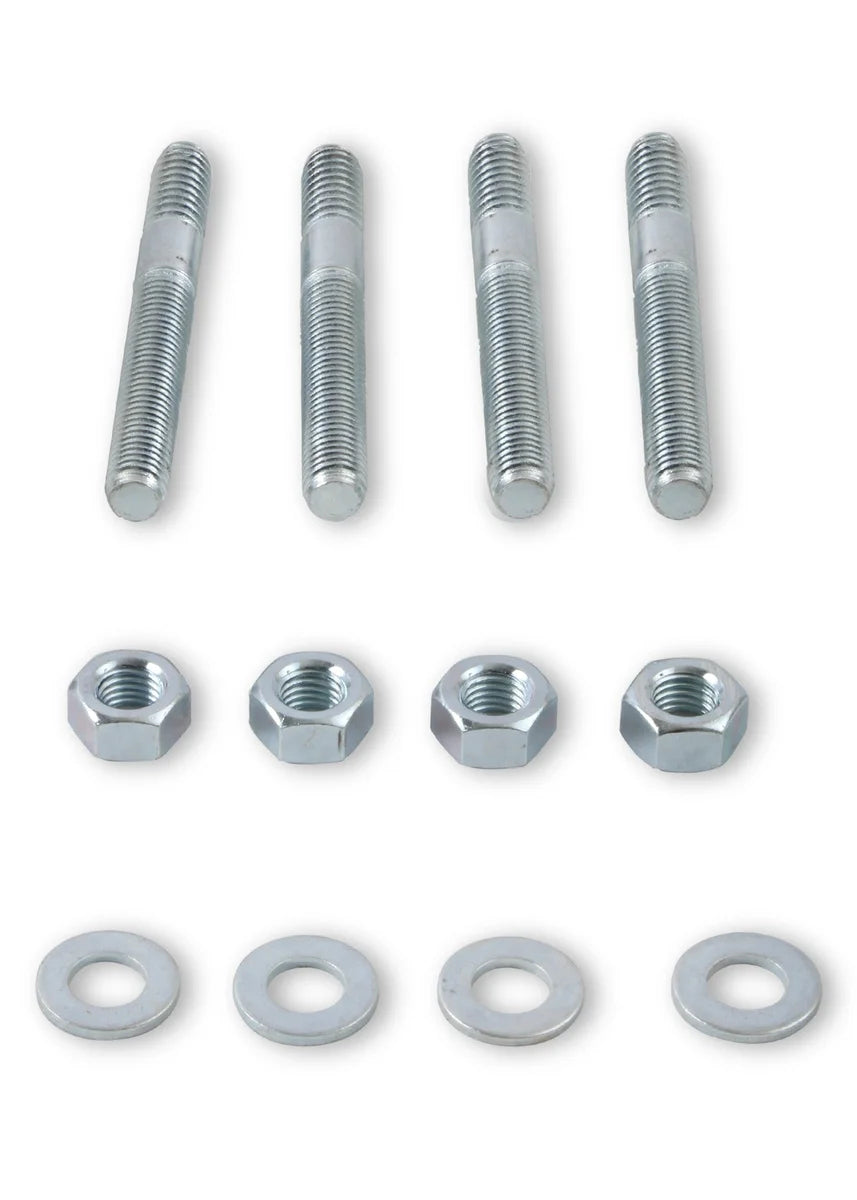 Description_MKT | This is a high quality long stud that will be needed if you add a carburetor spacer under your carb. This is usually something that you will forget up until you set that carb on and the bolts are too short. So pick up a set today and have them ready. These zinc-plated studs help prevent stripped out threads in your aluminum intake manifold, hold the gasket in place and guide the carburetor on. Includes 4 studs, nuts & washers. Extra long 2-1/2 inch length. |