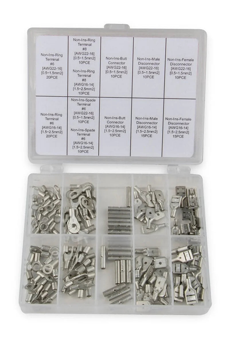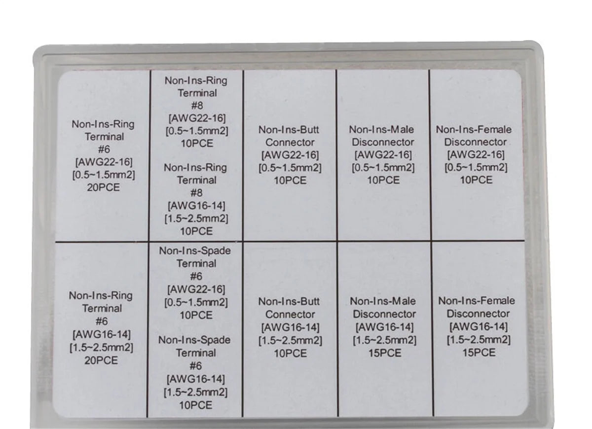 Description_EXT | 150 Piece Non-Insulated Connector Kit, Spade, Butt, Ring, Male and Female terminals |