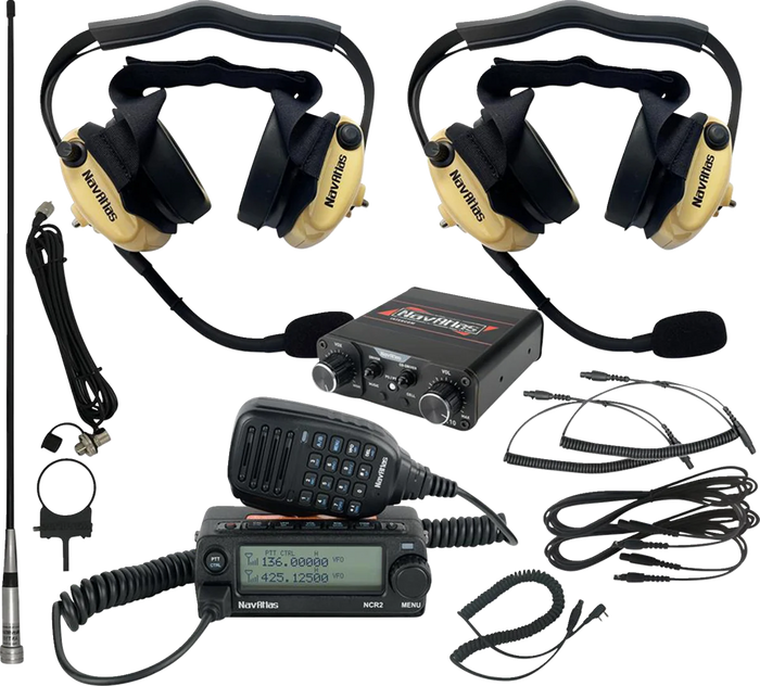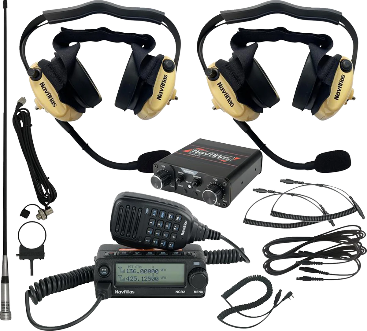 Kit includes: 1 NNT10 Compact Intercom and 1 NCR2 Car-to-Car Radio, 1 Pair NO202 Behind-the-Head (Stereo) Headsets, 2 PSC41 (PTT) push-to-talk cables, 2 HCF4 (Front) 4’ coil cables connecting the headsets to the HEC10 extension cables, 2 HEC10 (Front) 10’ extension cables connecting the intercom to the HCF4 coil cables to headsets and 1 APKG1 Dual Band Antenna with multiple mounting options. Intercom. High fidelity stereo sound for smart phone or other music source. VOX (Voice Activation). Separate front inputs for music and smartphones. Two front and two rear headphone inputs. RF shield housing. Compatible with car-to-car radio or handheld radio. Car-to-Car Radio. 200 programmable memorized Channels, identified by editing name. High quality 20 W dual band radio (UHF/VHF). Behind-the-Head Headset. Easy to use and reach volume knob and Push to Talk (PTT) Button. Poly-coated voice activated boom mic. Large noise cancelling comfortable ear seats. Soft pillow type over-the-head cushion.