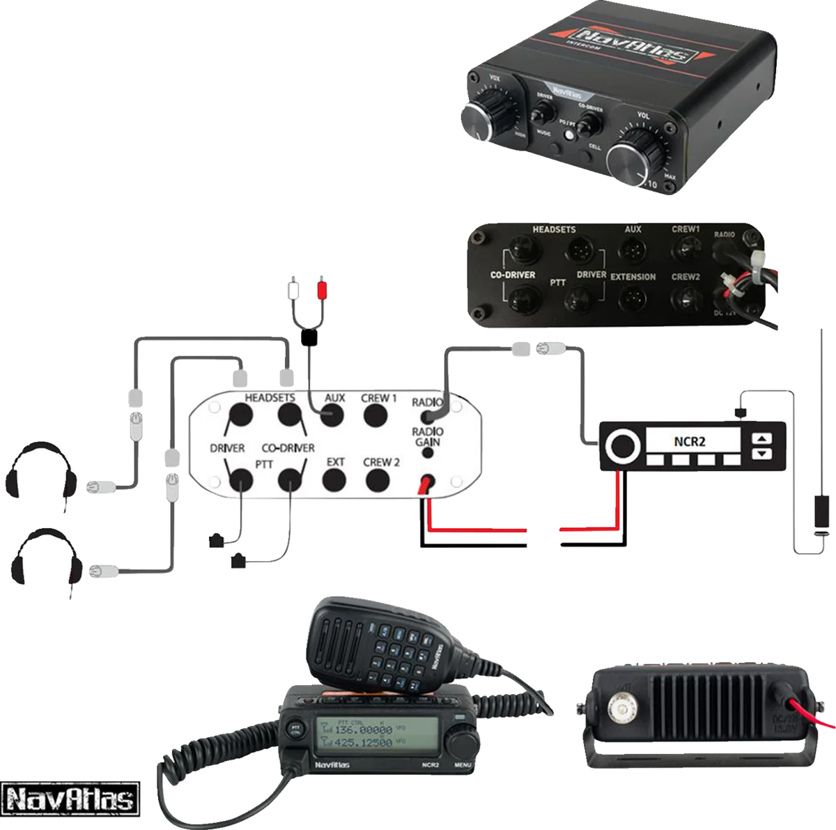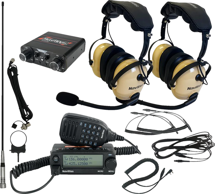 Kit includes: 1 NNT10 Compact Intercom and 1 NCR2 Car-to-Car Radio, 1 Pair NO303 Over-the-Head (Stereo) Headsets, 2 PSC41 (PTT) push-to-talk cables, 2 HCF4 (Front) 4’ coil cables connecting the headsets to the HEC10 extension cables, 2 HEC10 (Front) 10’ extension cables connecting the intercom to the HCF4 coil cables to headsets and 1 APKG1 Dual Band Antenna with multiple mounting options. Intercom. High fidelity stereo sound for smart phone or other music source. VOX (Voice Activation). Separate front inputs for music and smartphones. Two front and two rear headphone inputs. RF shield housing. Compatible with car-to-car radio or handheld radio. Car-to-Car Radio. 200 programmable memorized Channels, identified by editing name. High quality 20 W dual band radio (UHF/VHF). Frequency VHF: 136-174MHz / UHF: 400-480MHz. Over-the-Head Headset. Easy to use and reach volume knob and Push to Talk (PTT) Button. Poly-coated voice activated boom mic. Large noise cancelling comfortable ear seats. Soft pillow type over-the-head cushion.