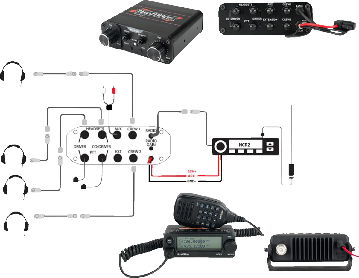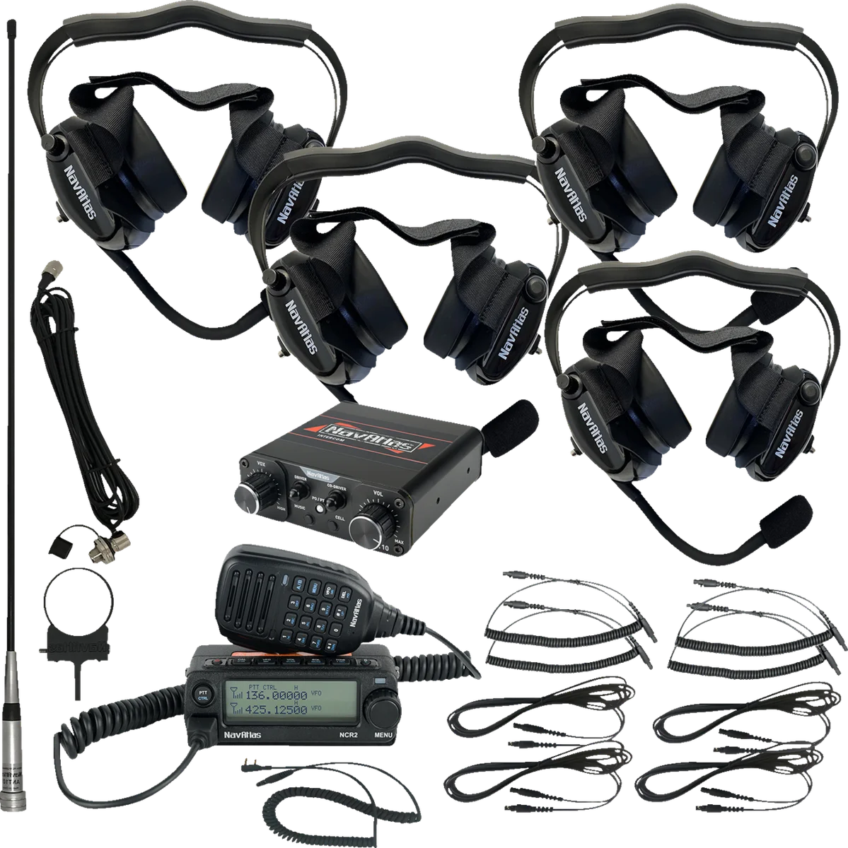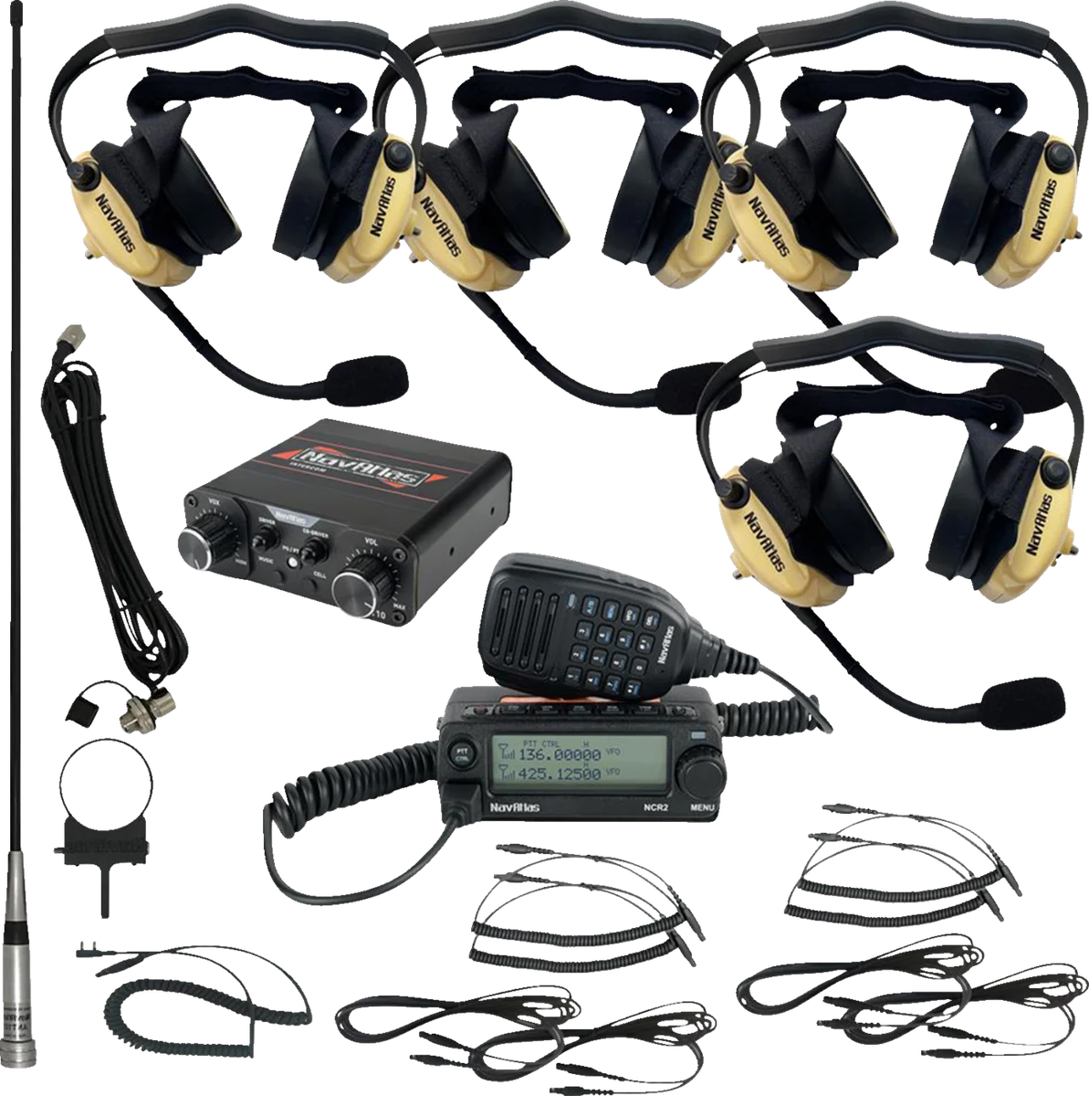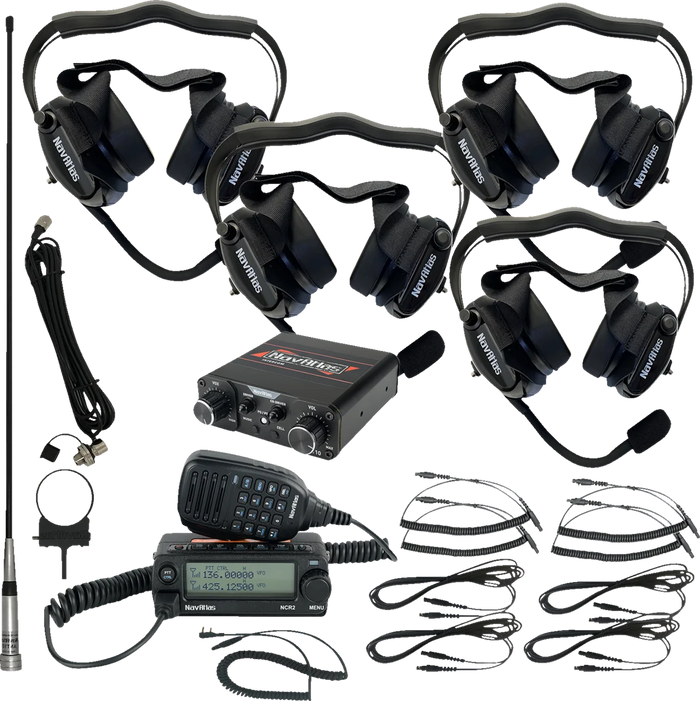 Kit includes: 1 NNT10 Compact Intercom and 1 NCR2 Car-to-Car Radio, 2 Pair NB202 Behind the Head (Stereo) Headsets, 4 HCF4 (Front/Rear) 4’ coil cables connecting the headsets to the HEC10 extension cables, 2 HEC10 (Front) 10’ extension cables connecting the intercom to the HCF4 coil cables to headsets,1 RTI300 intercom to radio connection cable, 2 16' extension cable and 1 APKG1 Dual Band Antenna with multiple mounting options. Intercom. High fidelity stereo sound for smart phone or other music source. VOX (Voice Activation). Separate front inputs for music and smartphones. Two front and two rear headphone inputs. Compatible with car-to-car radio or handheld radio. Car-to-Car Radio. 200 programmable memorized Channels, identified by editing name. High quality 20 W dual band radio (UHF/VHF). Frequency VHF: 136-174MHz / UHF: 400-480MHz. Behind-the-Head Headset. Easy to use and reach volume knob and Push to Talk (PTT) Button. Poly-coated voice activated boom mic. Large noise cancelling comfortable ear seats. Soft pillow type over-the-head cushion.