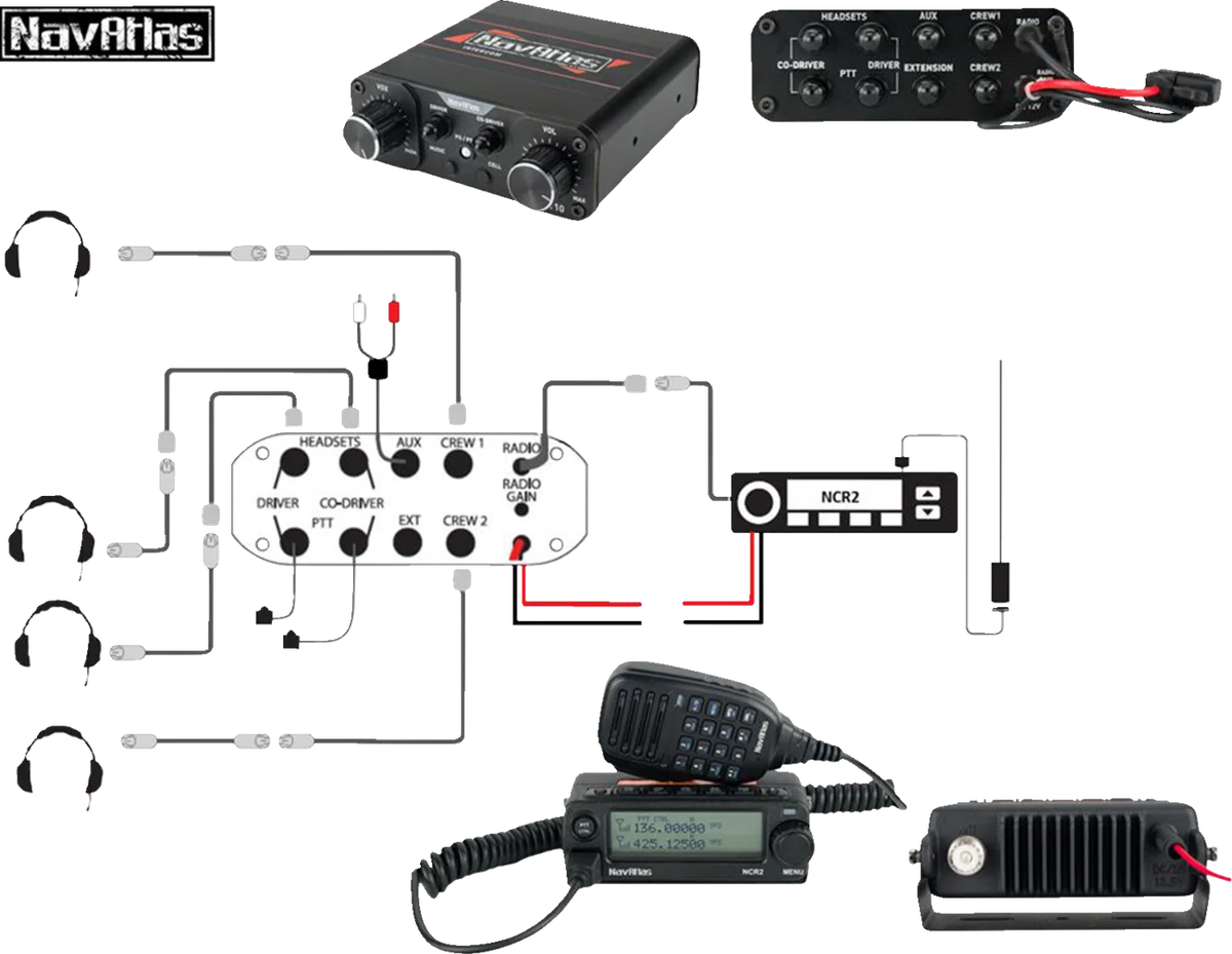 Kit includes: 1 NNT10 Compact Intercom and 1 NCR2 Car-to-Car Radio, 2 Pair NO303 Over-the-Head (Stereo) Headsets, 2 PSC41 (PTT) push-to-talk cables, 2 HCF4 (Front) 4’ coil cables connecting the headsets to the HEC10 extension cables, 2 HEC10 (Front) 10’ extension cables connecting the intercom to the HCF4 coil cables to headsets and 1 APKG1 Dual Band Antenna with multiple mounting options. Intercom. High fidelity stereo sound for smart phone or other music source. VOX (Voice Activation). Separate front inputs for music and smartphones. Two front and two rear headphone inputs. Compatible with car-to-car radio or handheld radio. Car-to-Car Radio. 200 programmable memorized Channels, identified by editing name. High quality 20 W dual band radio (UHF/VHF). Frequency VHF: 136-174MHz / UHF: 400-480MHz. Over-the-Head Headset. Easy to use and reach volume knob and Push to Talk (PTT) Button. Poly-coated voice activated boom mic. Large noise cancelling comfortable ear seats. Soft pillow type over-the-head cushion.