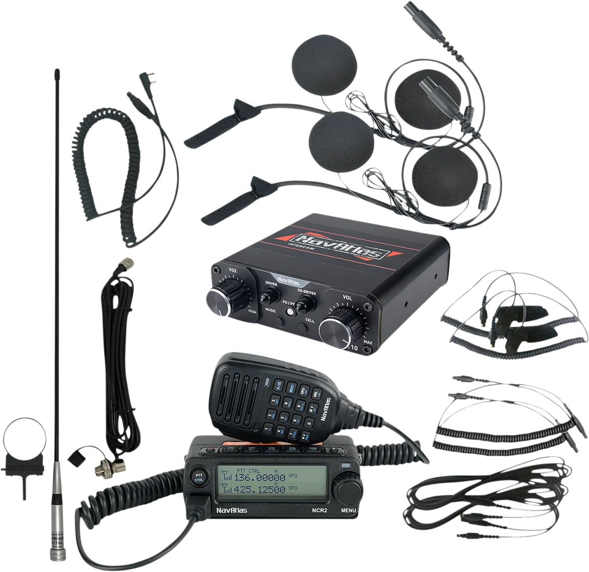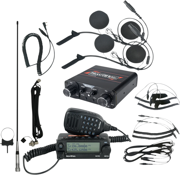 Each 2 seat kit comes with required equipment needed for the rider in each seat, including;. 1 NNT10 intercom, 2 NH100 in-helmet headsets. 2 HEC10 cables and 2 HCF4 cables. Dual band car to car radio. Push to talk cable. Cable to connect the NCR2 radio to the NNT10 intercom. Antenna kit with mounting brackets and 16ft cable. Mounting bracket sold separately.