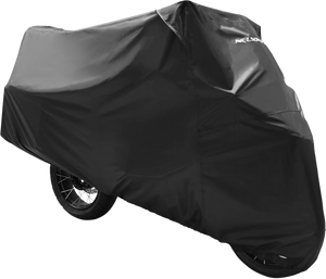 100% waterproof Tri-Max polyester with heat taped seams. Maximum UV protection against sun’s harmful rays. Packed in free compression bag for the ultimate in compact storage. Exclusive Perma-Venting™ system minimizes condensation and allows air circulation. Snug elastic hem and quick release belly strap secures cover to the bike. One-inch grommets at front wheel for cable lock (not included). Soft windshield liner protects against scratching.