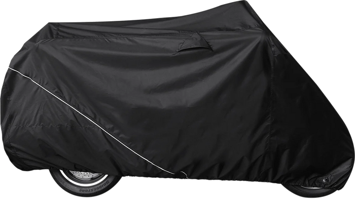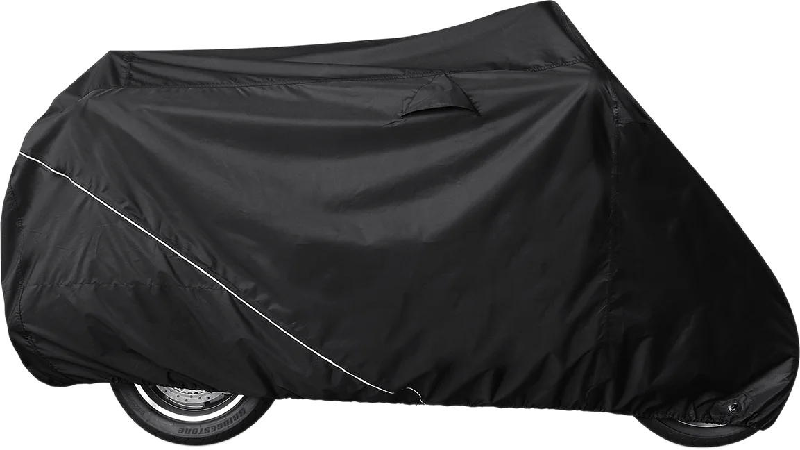Innovative UltraMax™ durable polyester material. Highest UV-rated cover in the industry. 100% waterproof, including heat-tapered seams. Reflective strip along sides and back for increased visibility. Integrated heat-resistant panels for exhaust pipe protection. Exclusive Perma-Venting® system allows air circulation. Soft windshield liner protects against scratching. Snug elastic hem and quick-release belly strap secures cover to bike. Packed in multi-use compression bag for compact storage. Grommets at front wheel for cable lock (not included).
