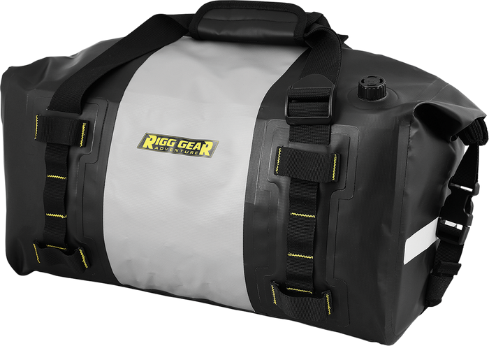 100% waterproof duffle bag. Electronically heat welded seams. Made from durable and waterproof PVC Tarpaulin. Watertight roll closure with quick release buckles. UV coated outer material cleans easily and prevents slipping or marking. Securely mounts using patented RIGG STRAP® system. Removable internal panels help bag hold its shape. Can be mounted across or along seat or tail section. Purge valve makes for compression easy. Dual-purpose carry handles can be used as compression straps. Reflective accents for enhanced visibility. Mounts to motorcycle, ATV/UTV, PWC, and snowmobile.