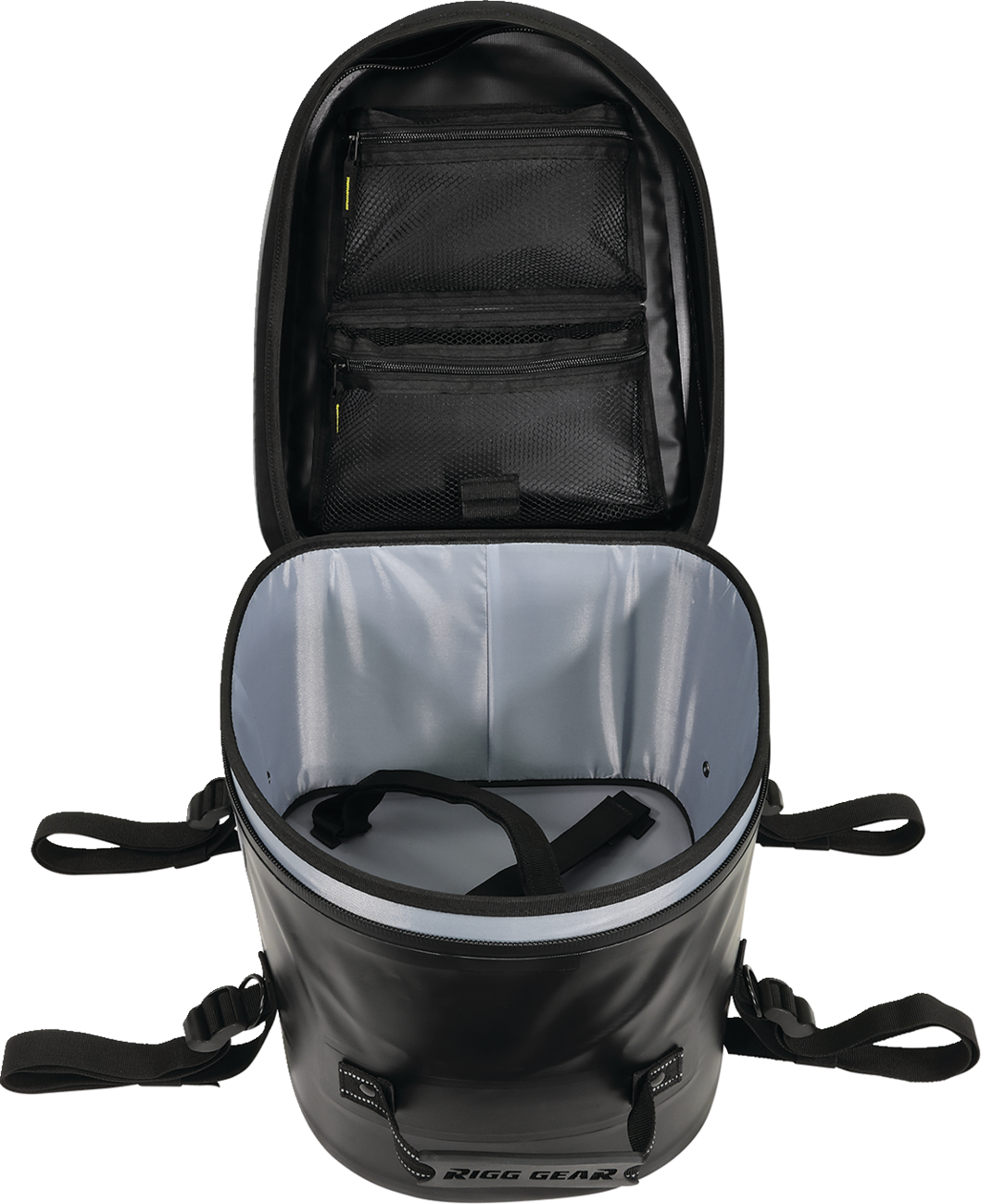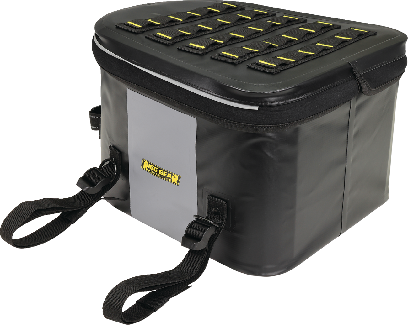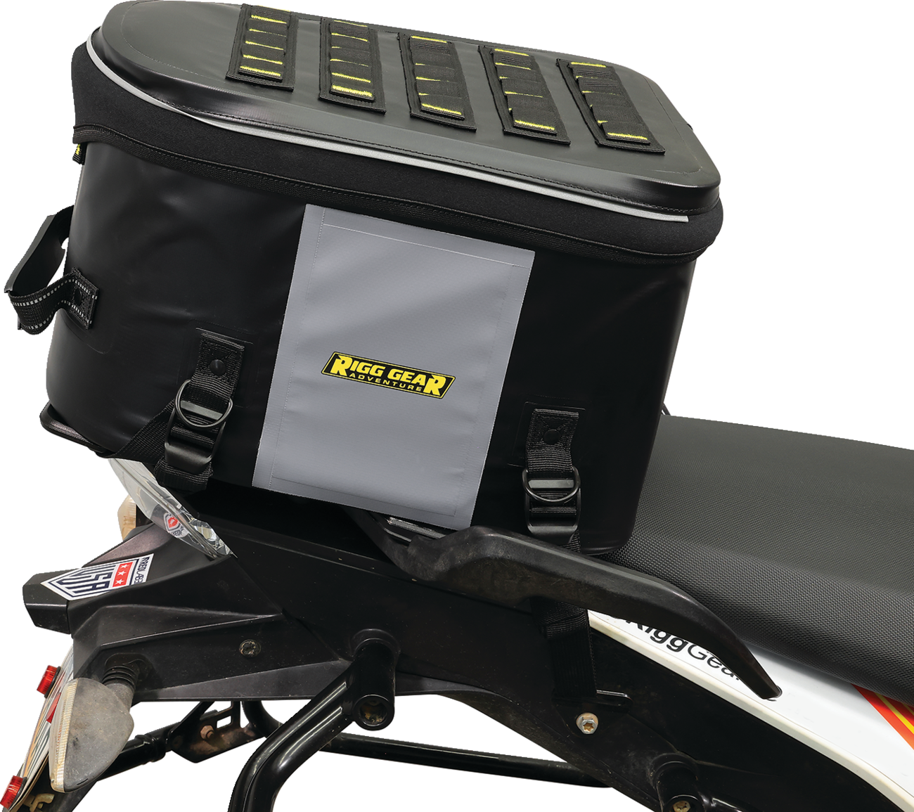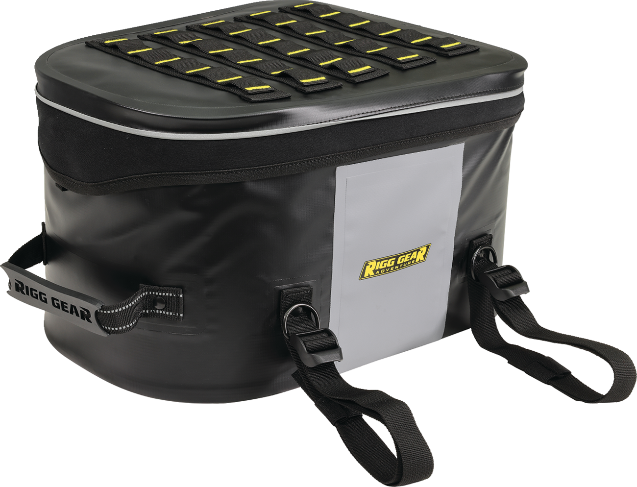 Universal waterproof tail bag made from heavy-duty UV-treated PVC tarpaulin material. All seams are electronically heat welded. Heavy-duty webbing and buckles for easy and secure mounting. Rigid construction allows the bag to hold its shape when empty. Protective base material prevents slipping or marking. Inner self-fastening x-straps help to secure contents better. Waterproof flap helps keep dust and dirt away from water resistant zippers. MOLLE panel on lid allows other items to be strapped down. Rubberized carry handle for easy transport. Lifetime warranty.