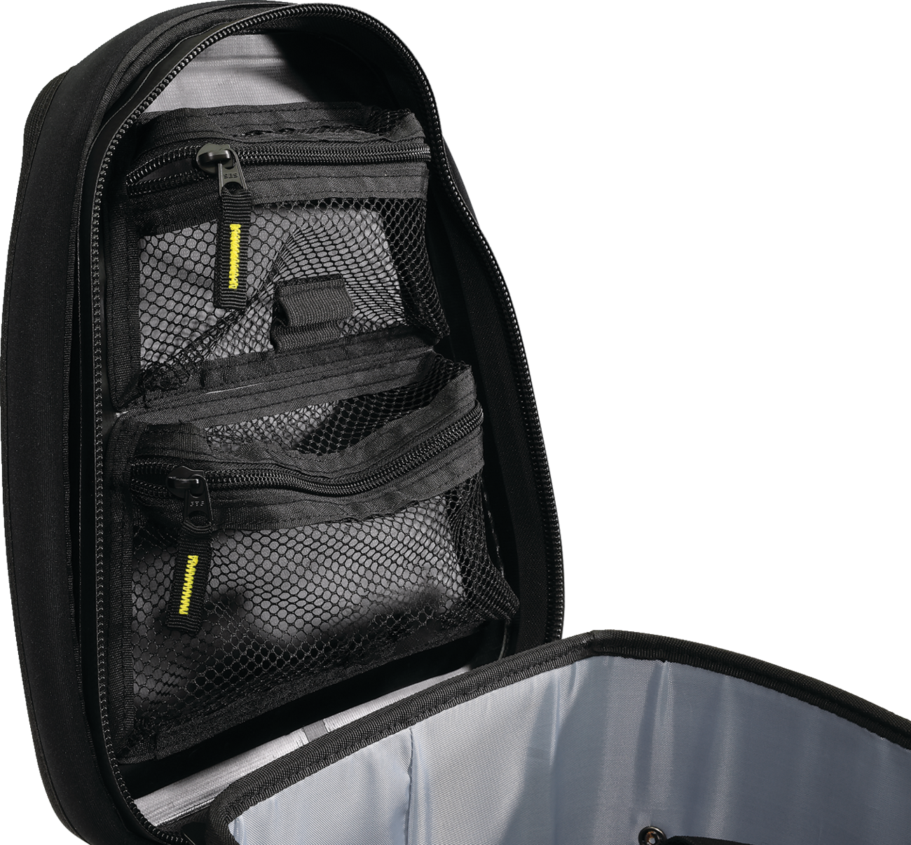 Universal waterproof tail bag made from heavy-duty UV-treated PVC tarpaulin material. All seams are electronically heat welded. Heavy-duty webbing and buckles for easy and secure mounting. Rigid construction allows the bag to hold its shape when empty. Protective base material prevents slipping or marking. Inner self-fastening x-straps help to secure contents better. Waterproof flap helps keep dust and dirt away from water resistant zippers. MOLLE panel on lid allows other items to be strapped down. Rubberized carry handle for easy transport. Lifetime warranty.
