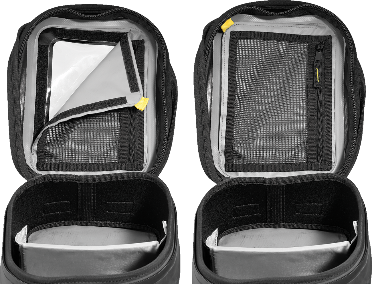 Made from heavy duty UV-treated PVC Tarpaulin (TPU) material. All seams are electronically heat welded. UV-coated outer material. Quick release strap system for easy attachment and refueling. Protective base material prevents slipping or marking. Adjustable divider to help organize your gear. Waterproof flap helps keep dust & dirt away from waterproof zippers. Clear touchscreen device-friendly top pocket. Rubberized carry handle for easy transport. Small mesh pocket under lid.