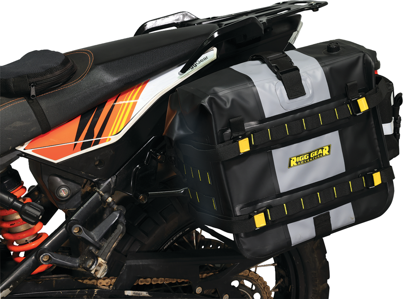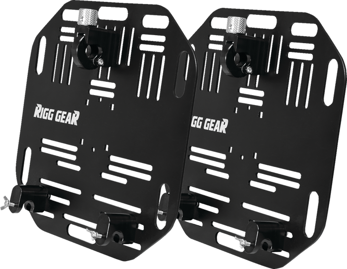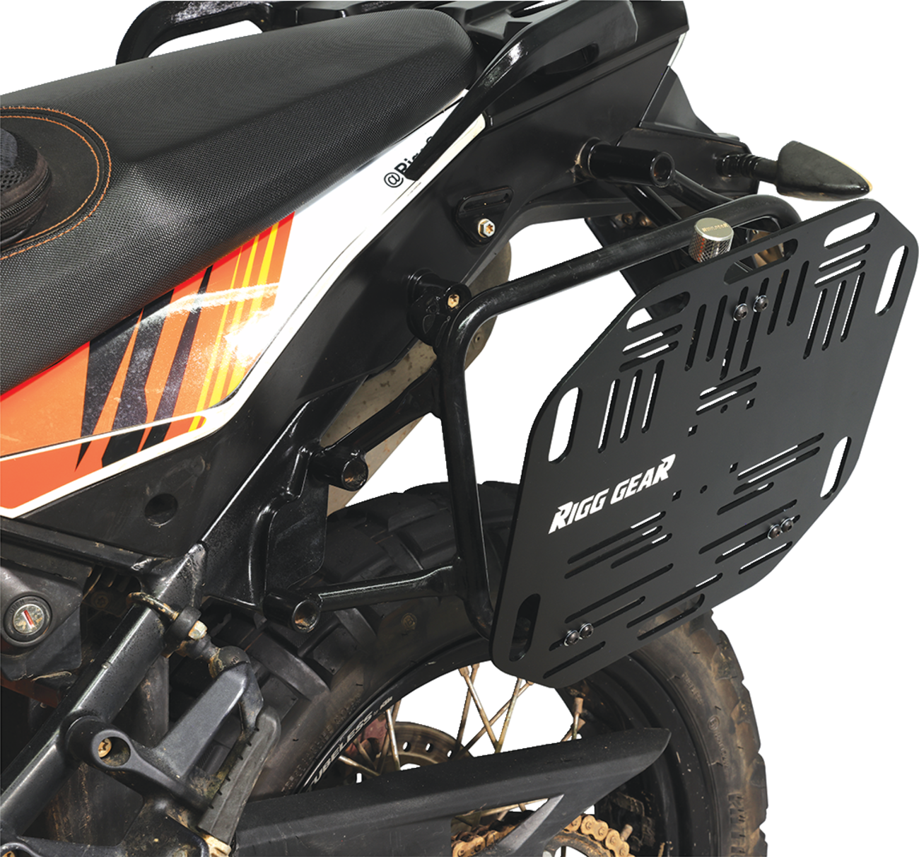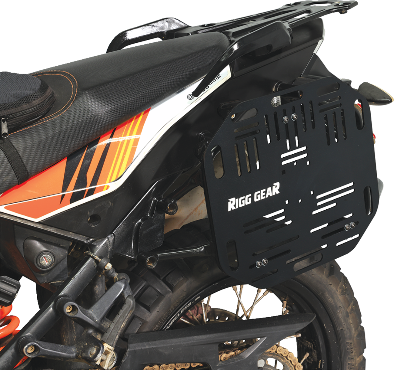 Universal saddlebag quick release plate. Aircraft grade aluminum plate and mounting hardware. Powder-coated and anodized finish for maximum durability. Stainless steel screws and washers will not rust. Fits most tubular pannier racks up to 18mm and 20mm racks with optional latch. Compatible with racks offset for exhaust with optional aluminum extension. Designed for Rigg Gear Hurricane and Sierra saddlebags. Works with Sierra or other dual sport saddlebags with optional strap. Accomodates most aftermarket soft panniers. Lockable release latch (lock sold separately). Can be hard mounted to most plastic hard cases. Rotopax ready. 30 lb weight limit or the weight limit of your pannier pack (whichever is lesser).