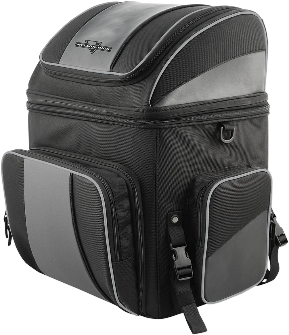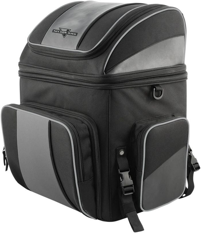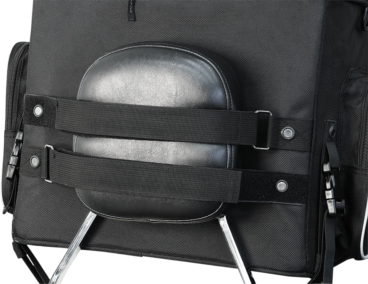 Industry leading UltraMax™ fabric with maximum UV protection. Mounts to luggage rack, sissy bar or passenger seat with quick release and self-fastening straps. Large lower and smaller top divided storage compartments with lockable zippers. Front pocket folds down to access main storage. Zippered divider in top section converts entire bag one massive compartment. Additional 3” expansion section for extra storage. Three outside pockets for quick access items. Fully lined interior with rigid construction. Solid floor panel to prevent sagging. Carrying handle for easy transporting when off the bike. Heavy-duty lockable zippers with pull fobs for use with gloves. Reflective piping for increased visibility. Waterproof rain hood included. Main compartment: 15”L x 12”W x 12”H holds 35.5 liters. Top compartment: 15”L x 12”W x 6”H holds 18 liters.