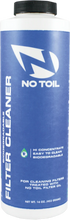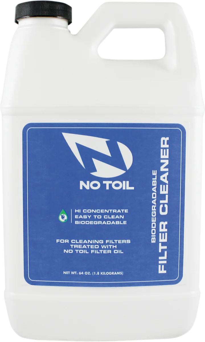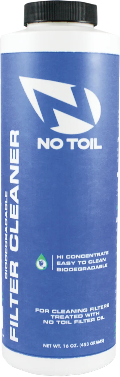 Concentrated formula designed to mix with water; no solvents are required to clean No-Toil treated air filters. Breaks down the waterproofing chemicals of the No-Toil filter oil and rim grease before completely washing the oil, grease, dust and dirt from the filter. Non-toxic, no-fume/no-odor cleaning solution is skin-safe, and can be used to clean filters in a bucket of water or the kitchen sink. It's biodegradable, so go ahead and dump the dirty solution right down the drain!.